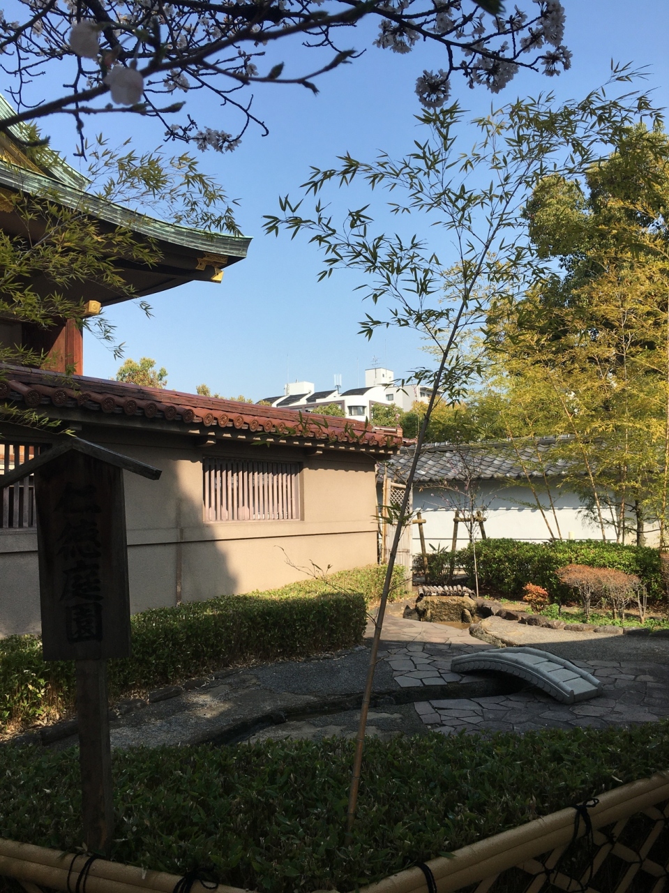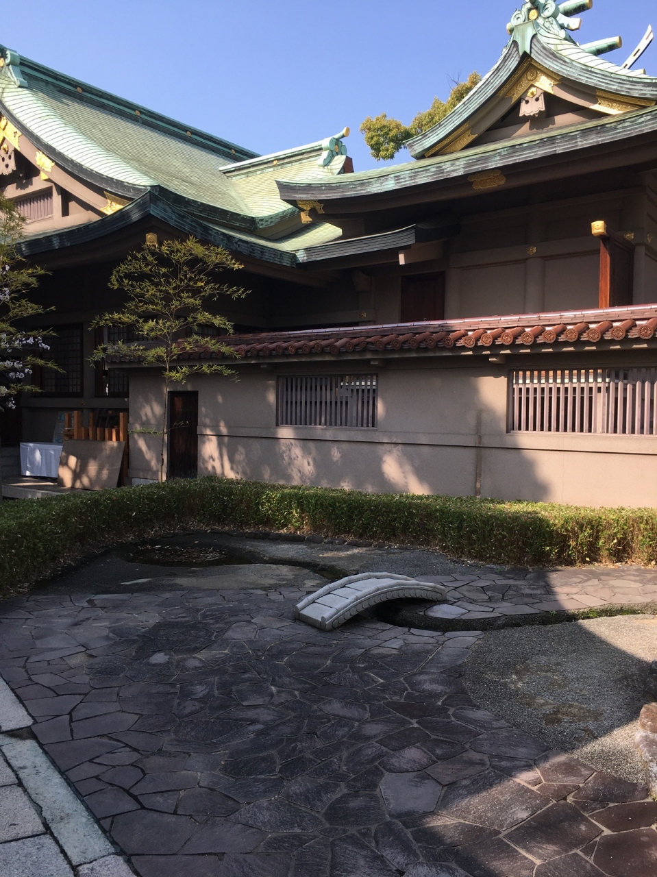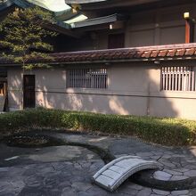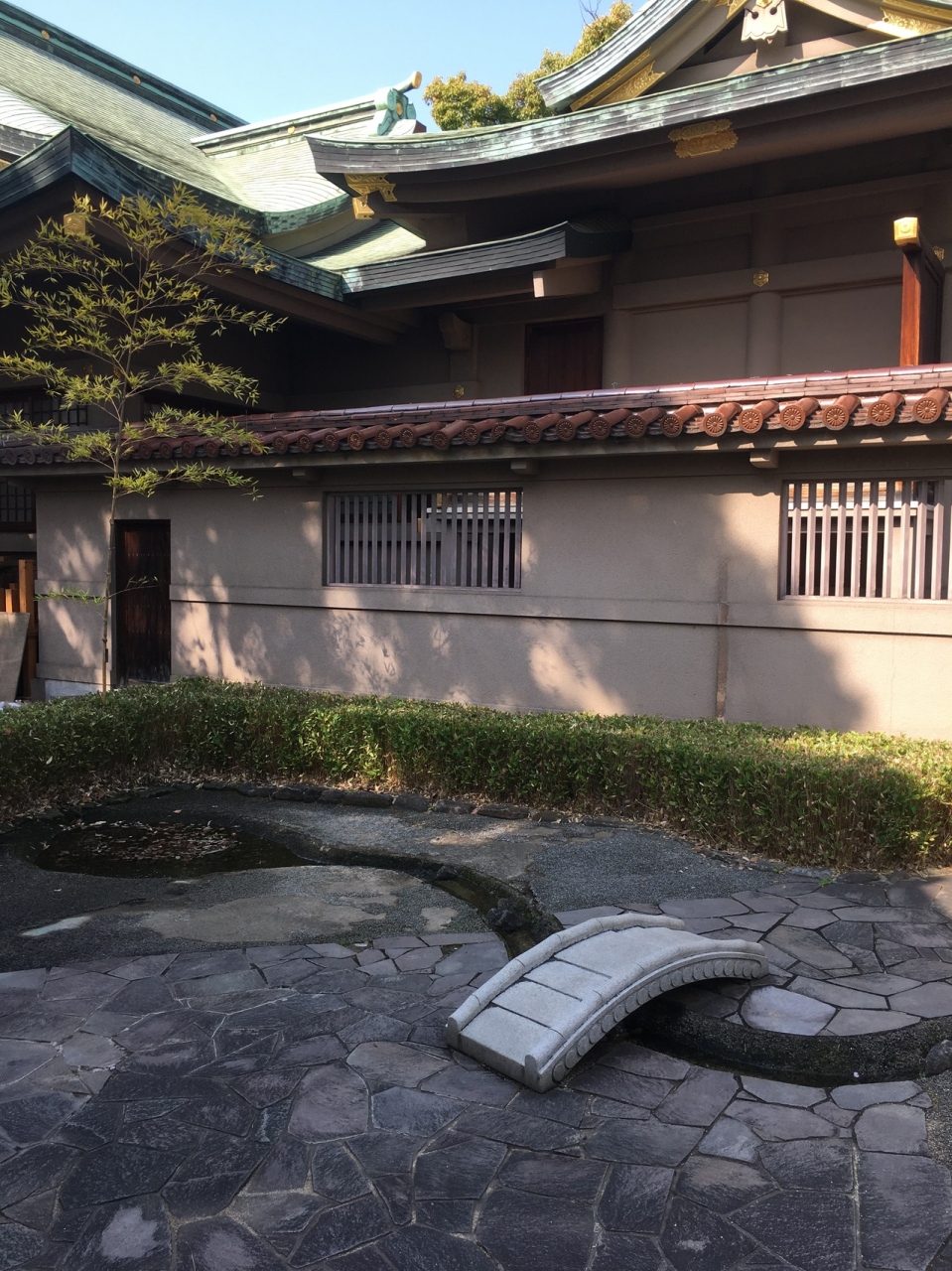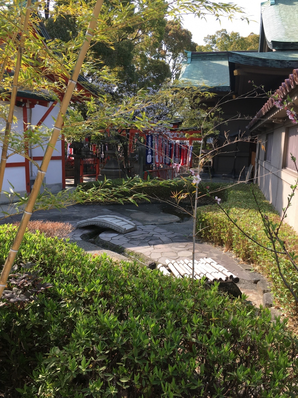 高津宮の社殿の裏側にあるので見つけにくい庭園でした。小さな小さな橋があり、下は川を模したコンクリートになっていましたが水はなかったです。周り整備された草木が生え、竹もありました。池を模したところもありましたが此方も水はなかったです。