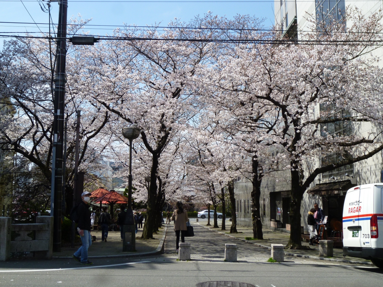 白川南通が川端通りとぶつかる場所は桜シーズンの真っ盛りであれば、観光客で賑わってみんなが記念撮影を楽しむ観光スポットとなる場所です。しかし今年はコロナの影響で人込みもなく、ゆっくりと桜を鑑賞することができました。