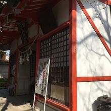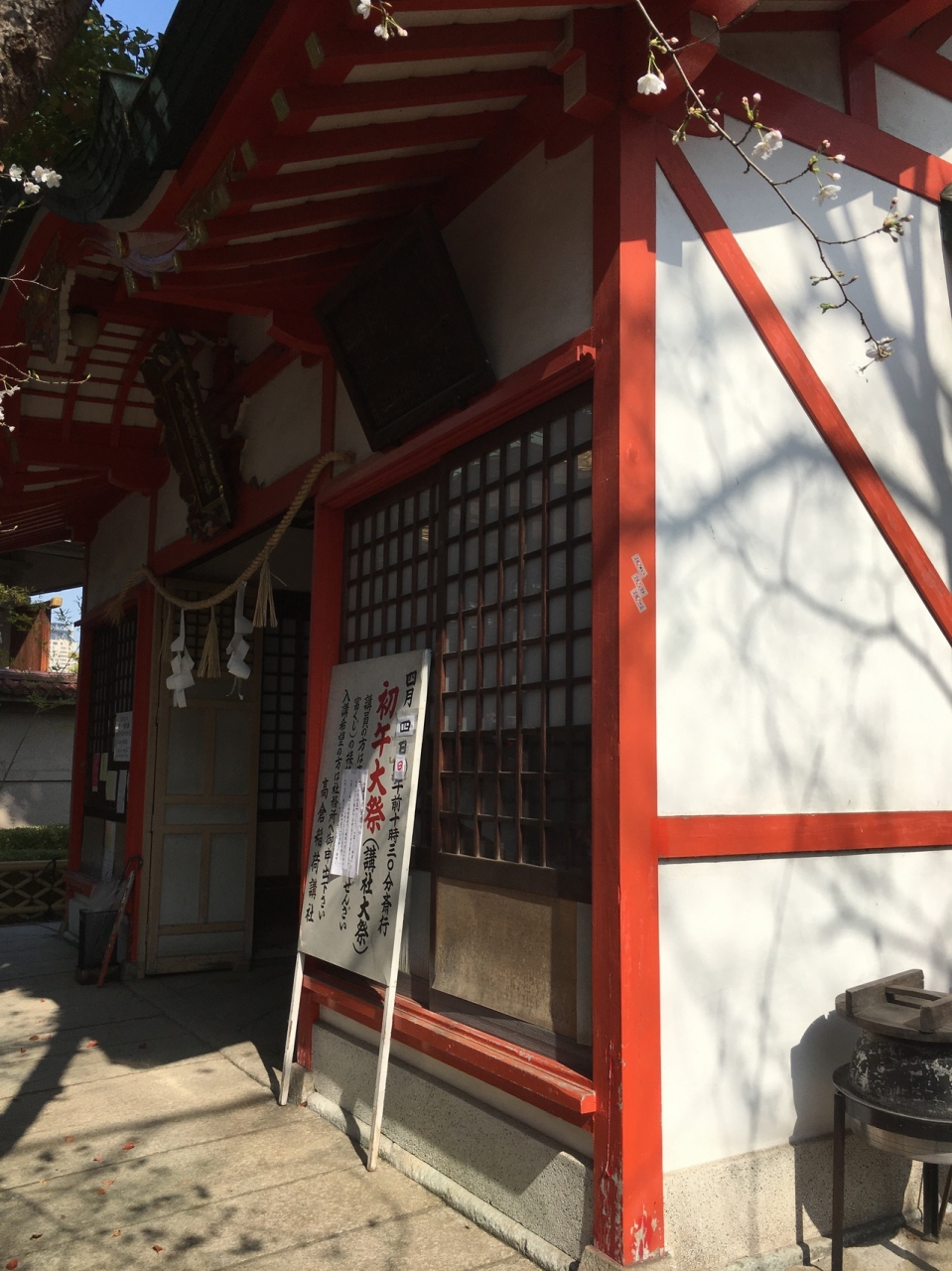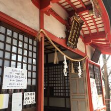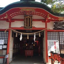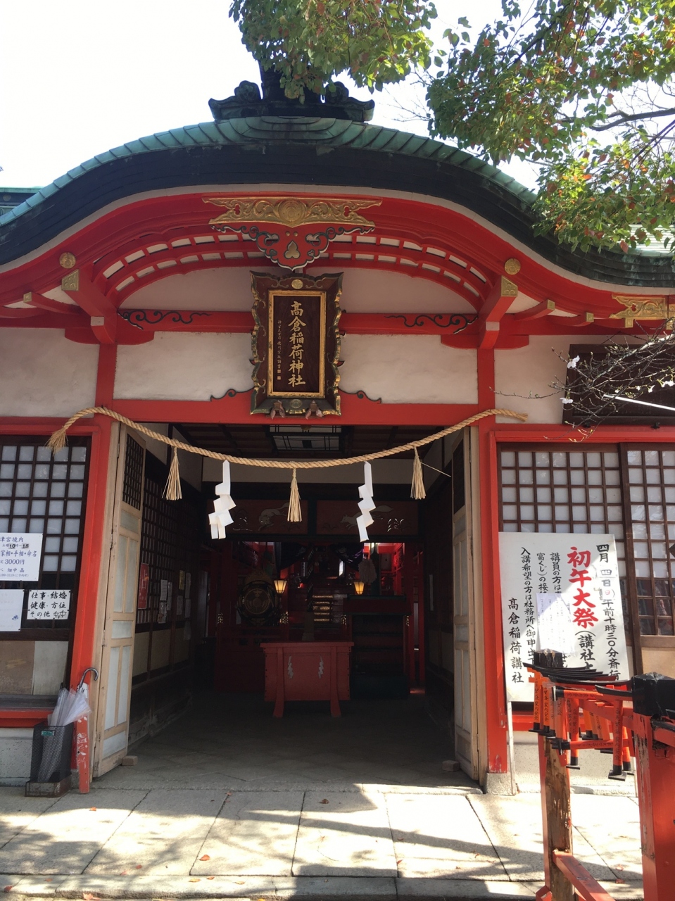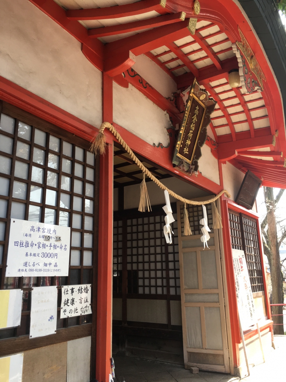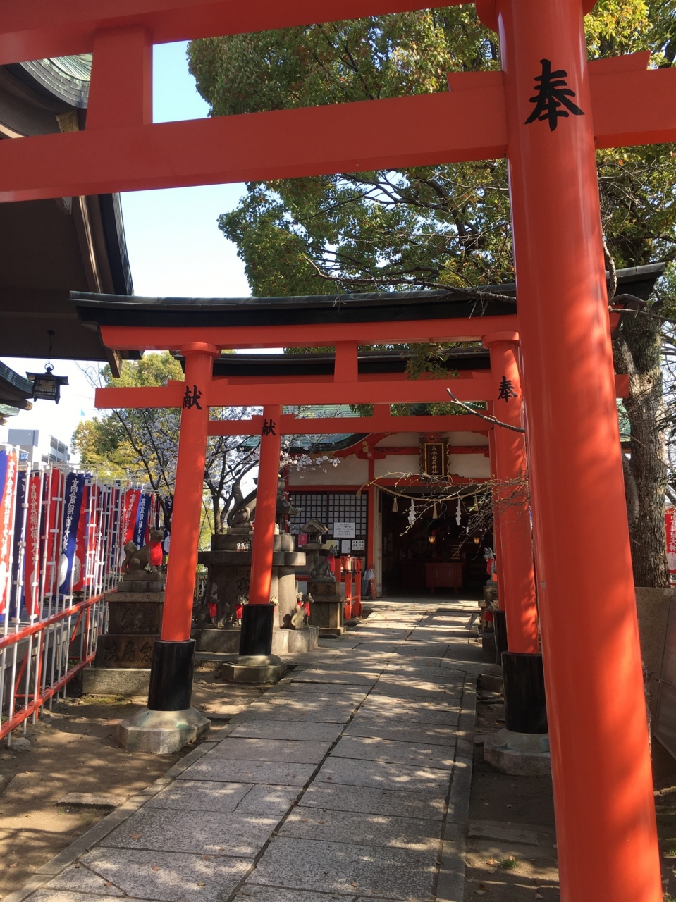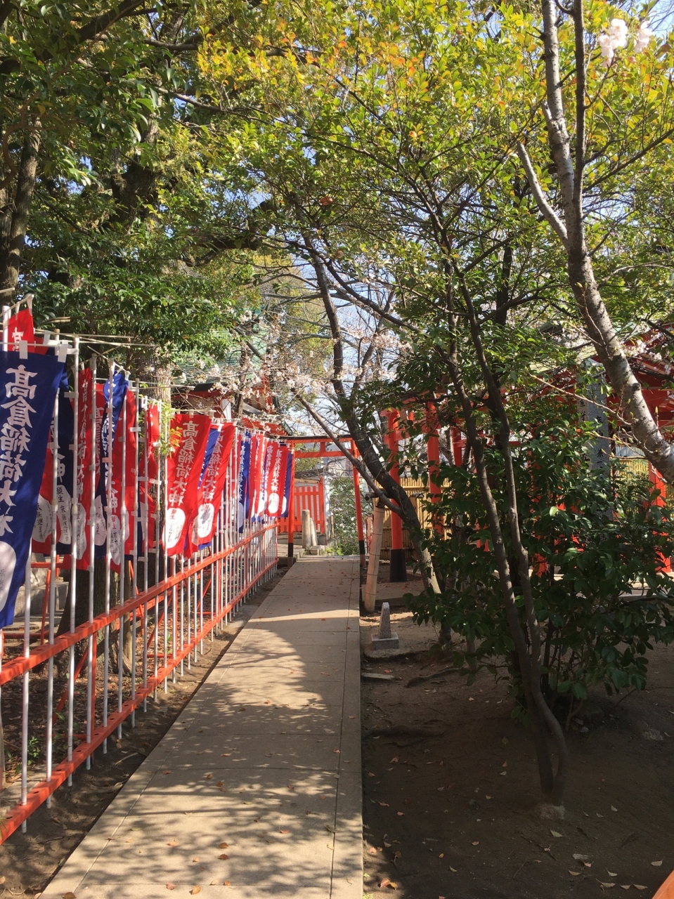 高津宮の境内にある赤と青の幟が並んだ神社で赤い鳥居もいくつか連なっていました。社殿の手前には小さなミニチュアのような鳥居も連なっていて可愛らしい光景でした。狐の像もあり、赤い前掛けをしていました。新緑には囲まれた神社です。