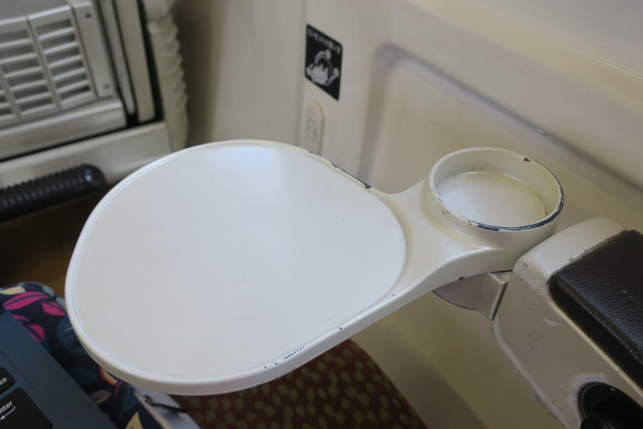 別府⇔博多間で乗車しました。乗車中にパソコン作業をするため、全席の背面に付いているテーブルを倒したけど、自分との距離が遠く、使いづらい。で、肘置きに付属しているテーブルを出してみたけど、こちらはパソコンを置くには小さすぎてパス。それで、自分の膝上に置いて触り始めたものの、運転中、結構揺れて、結局、気分が悪くなって止めました。窓際の席には、コンセント差込口があって便利なんですが。