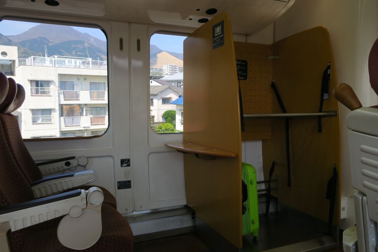 車両の端に荷物置き場があって、スーツケース等大きな荷物は、そのスペースを使えます。