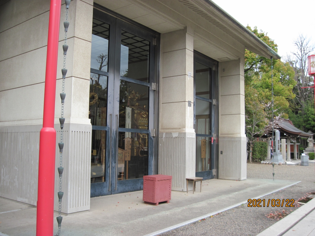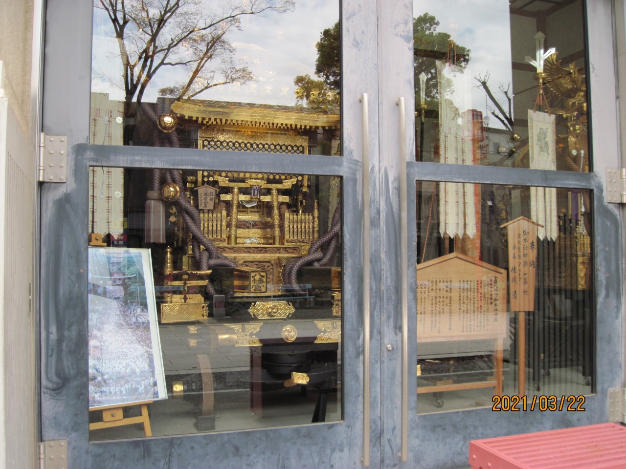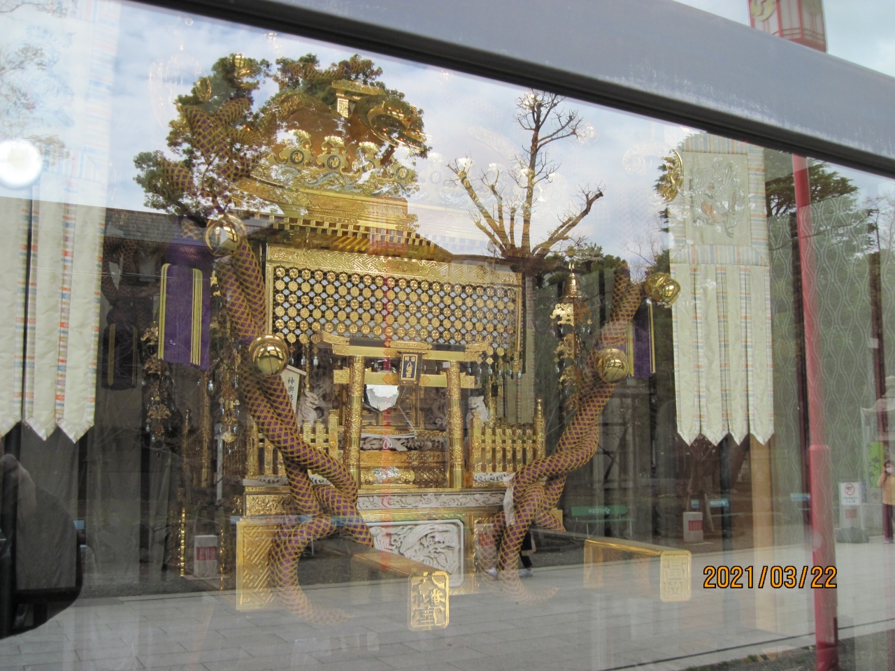 富岡八幡宮の境内に、ガラスケースに入って飾られているお神輿です。但しケースといってもそれが建物ですので、その大きさと豪華さにびっくりしました。お神輿の上に乗っている鳳凰の装飾など、いったいどのくらいの費用がかかっているのかと思いました。