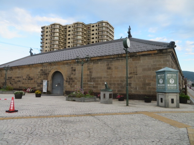 元小樽倉庫という石造りの重厚な建物を利用した観光案内所兼お土産屋さんです。威風堂々とした立派な建物ですが、小樽の歴史的建築物の前にある紫の看板はありませんでした。看板の代わりに「消防犬 ぶん公」の像がありました。可愛い雰囲気なのにマスクが大きすぎて、顔がわからないのが残念でした。