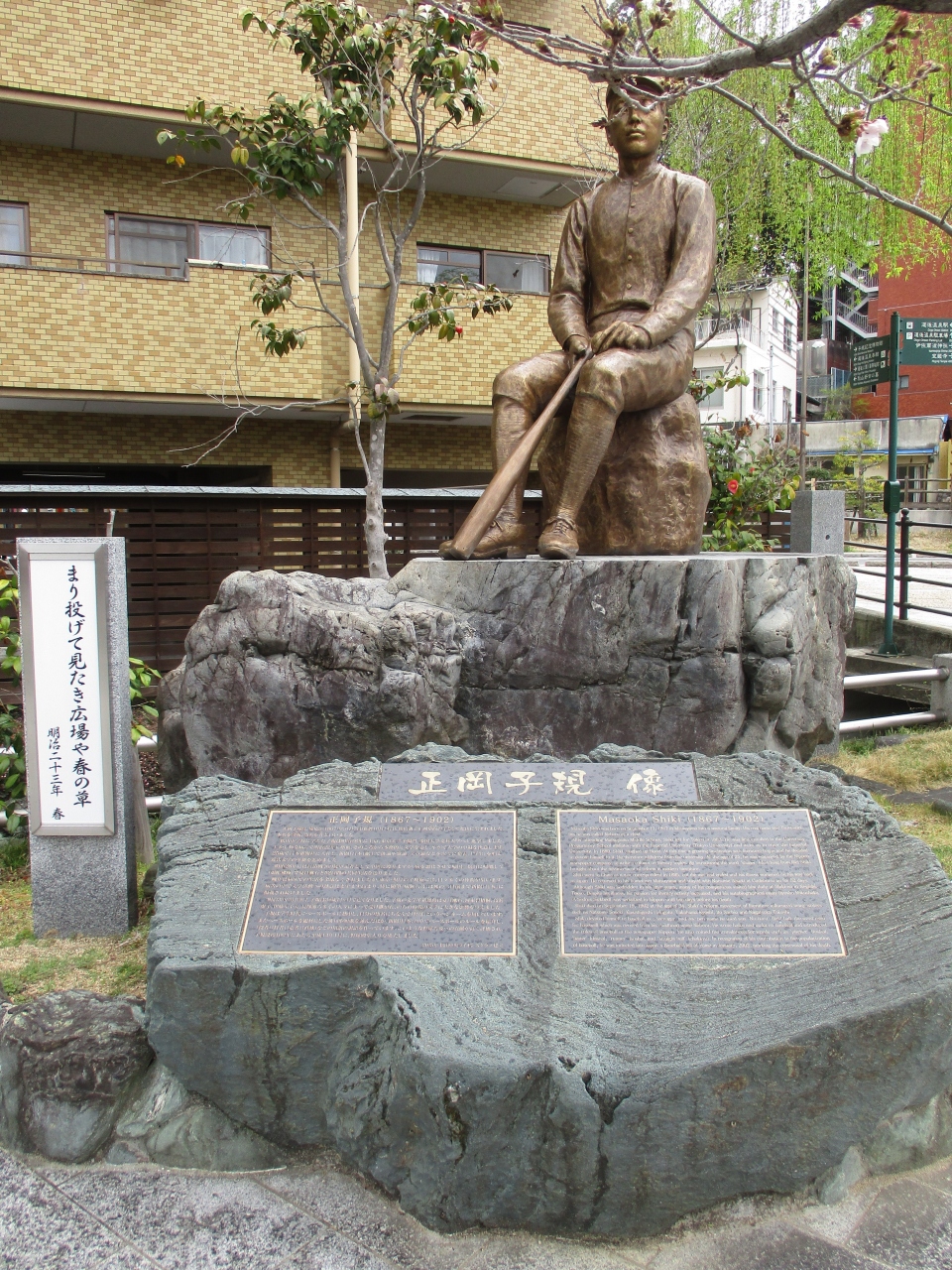 正岡子規像が道後温泉駅前のからくり時計や足湯がある広場の端にありました。正岡子規は、野球というペンネームを使ったり、野球を日本に紹介したり、普及に大きな貢献をしました。このため、野球殿堂入りをしていると近くの案内板に記載されていました。