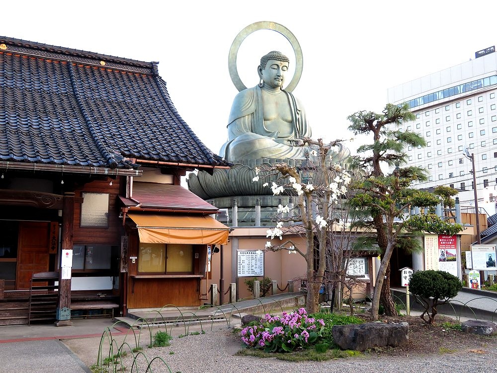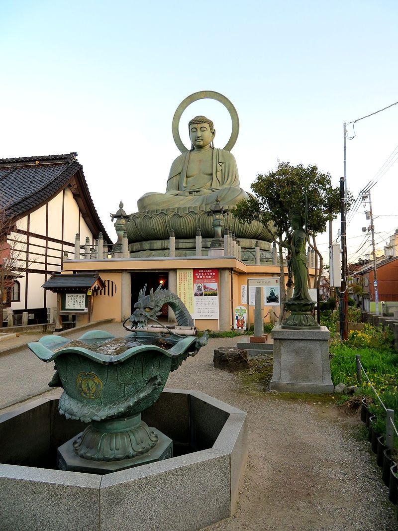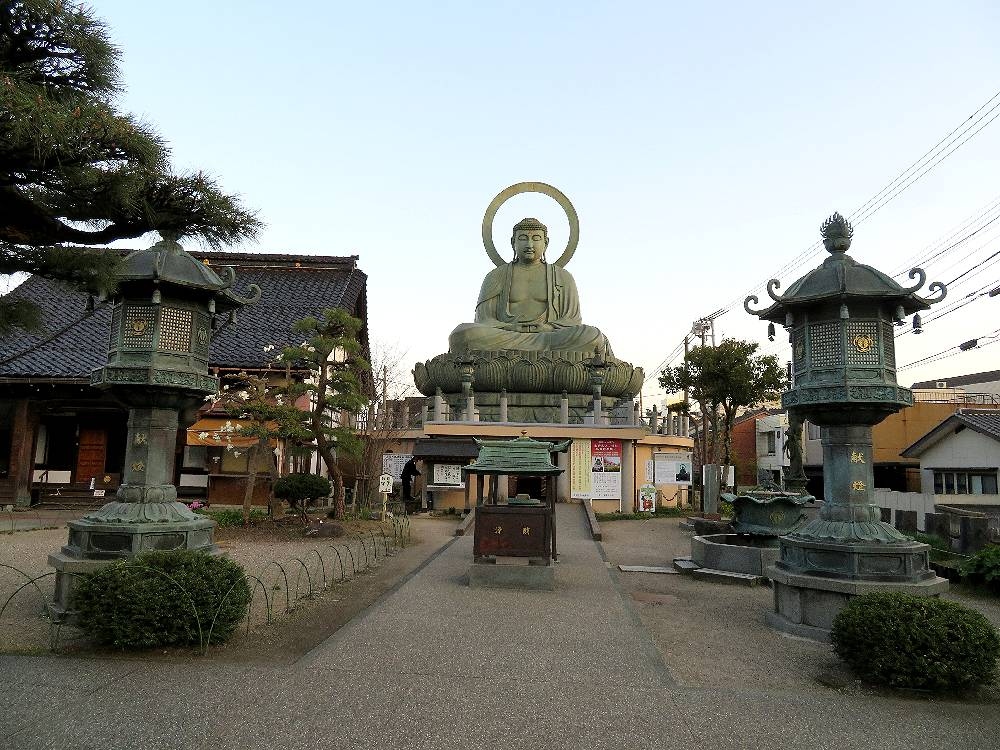 高岡駅から居酒屋や食べ物屋が並ぶ路地を歩いて行きました。夕方6時前ということもあったせいか見学者は私達の他に1人だけでした。奈良、鎌倉の大仏様とは大きさが異なり、思った以上に小さかったです。狭い敷地に鎮座するお姿は周囲とは異質の世界で、唐突感はぬぐえません。台座にあたるところに仏画が展示されていたので、一周してみました。おどろおどろしい地獄絵もあり、早々に出てきてしまいました。15分もあれは見て周れる規模でした。
