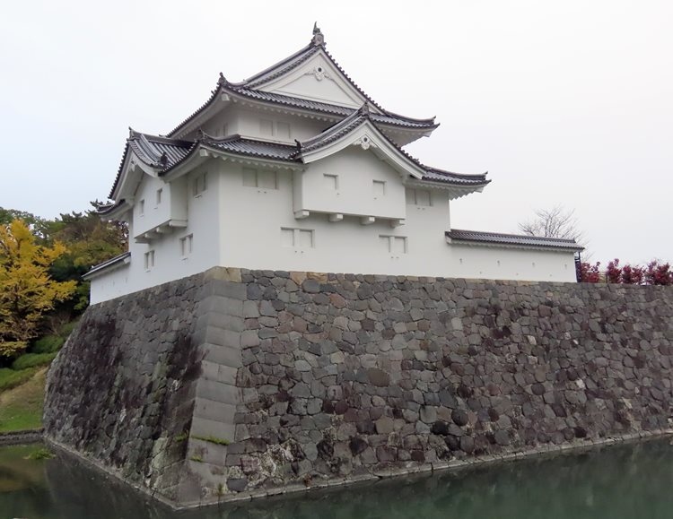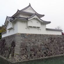 駿府城二ノ丸の南西を守る隅櫓です。2014年に復原されたものとのこと。多くの場合、お城の正面は東もしくは南ですが、駿府城址は東御門が復原されてることもあり、南東側の隅櫓のほうが目にしやすい存在です。そこを予習したうえで坤櫓の外観を確認するために城址公園の南西側からアクセスしてみました。白漆喰の外観で石落としが目立っていました。
