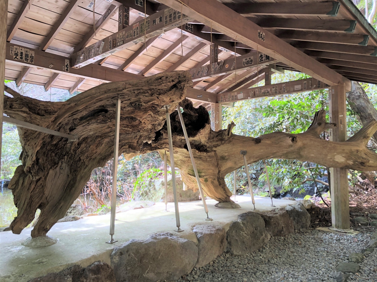 箱根神社の宝物殿の近く、屋根の付いた舎の中に、この「けけらの木(目代木)」が祀られています。平安の昔、この木が伊豆、駿河、相模の国の境界を示していたことから、国守の代理となって任国についていた役人「目代」にちなんで、この名がつけられたと言われています。