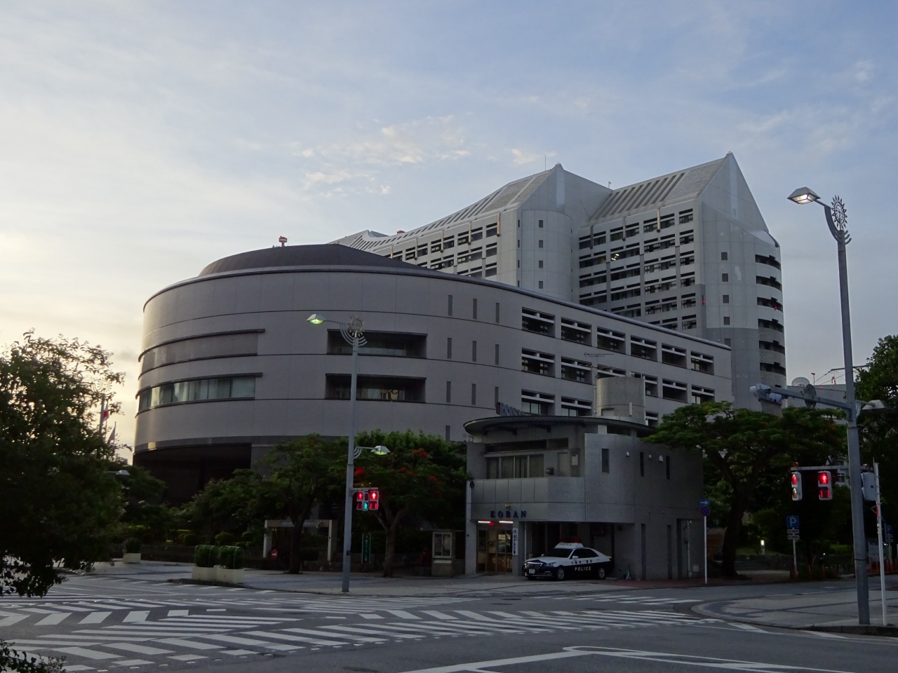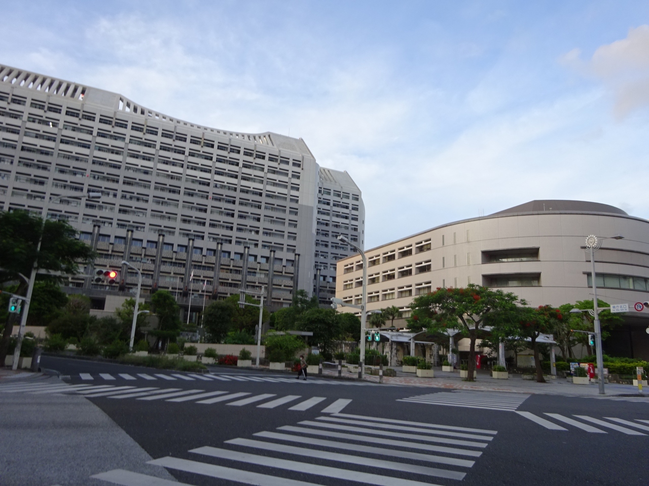 沖縄県庁は、その名の通りゆいレールの県庁前駅の近く、パレットくもじの道路をはさんだ前にあり、お隣は那覇市役所です。