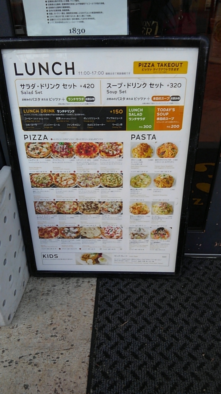 三井アウトレットパーク多摩南大沢の一角(飲食店がいくつかあります)にあるこちらの1830はパスタ、ピザが美味しいお店ですで、テラス席もあります。店外からも天なの様子が見えるので、心配なく一人でも気軽に入れる雰囲気が嬉しいです。夕方までランチセットが食べれるのも嬉しいです。