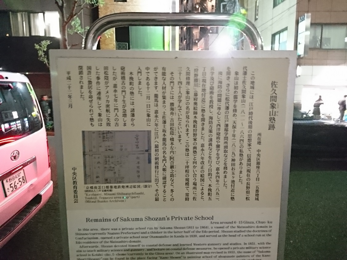 中央区銀座6丁目の歩道に佐久間象山塾跡の説明板が立っています。江戸時代後期の信濃国松代藩士で思想家だった佐久間象山が嘉永4年(1851年)に開いた佐久間象山塾が建っていた場所です。佐久間象山塾には勝海舟、吉田松陰、橋本左内など多くの有能な人材が集まったそうです。興味のある方には訪問をおすすめします。