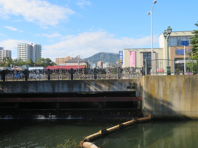 小樽運河の突き当たり、つまり妙見川と小樽運河の合流地点になり、橋の下を妙見川が流れています。なので、片側は小樽運河が見通せて、風光明媚な景色を堪能できます。ただし、もう片方の景色は運河の行き止まりということで、運河の突き当たりが見れますよ。