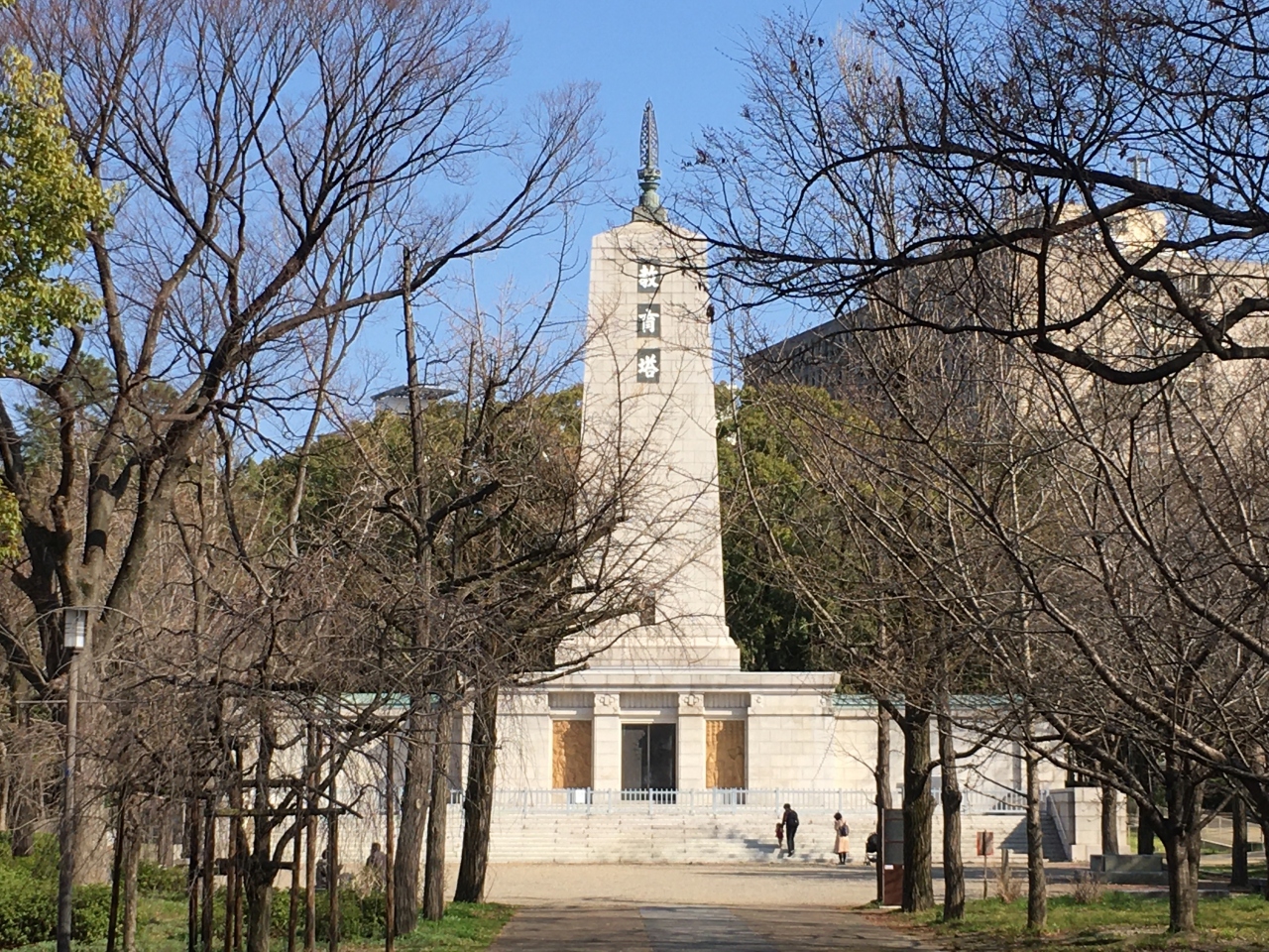 大阪城公園の大手門の南側、六番櫓が見える付近にある大きな塔です。1934年室戸台風で犠牲となった教育関係者の慰霊を目的として建設されました。1995年の阪神淡路大震災で犠牲となった教育関係者が、特別合葬されています。毎年10月30日に教育祭が行われ、殉職者が合葬されているとのことです。周囲には何もないのでとても目立つ塔です。