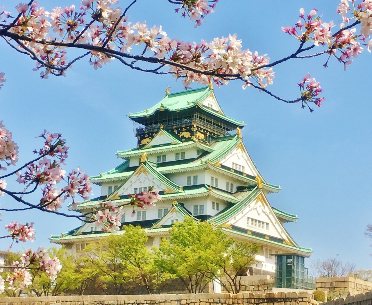 大手門から入り直進すると左手に庭園入口の看板が見えます。有料(200円)ですが、周遊バスで入れました。豊臣秀吉の正室・北政所の屋敷があったとされている場所で、1965年に開園しました。広い芝生の庭園内には迎賓館や焔硝蔵もあり、桜の名所としても知られています。大阪城天守閣や石垣すぐ近くにあり、内堀沿いの桜と一緒に見ることができてとても綺麗でした。大阪城公園内は多くのお花見客が訪れていましたが、こちらは人も少なくゆっくりとお花見鑑賞できます。