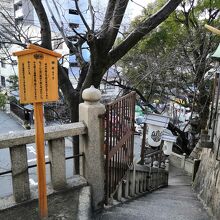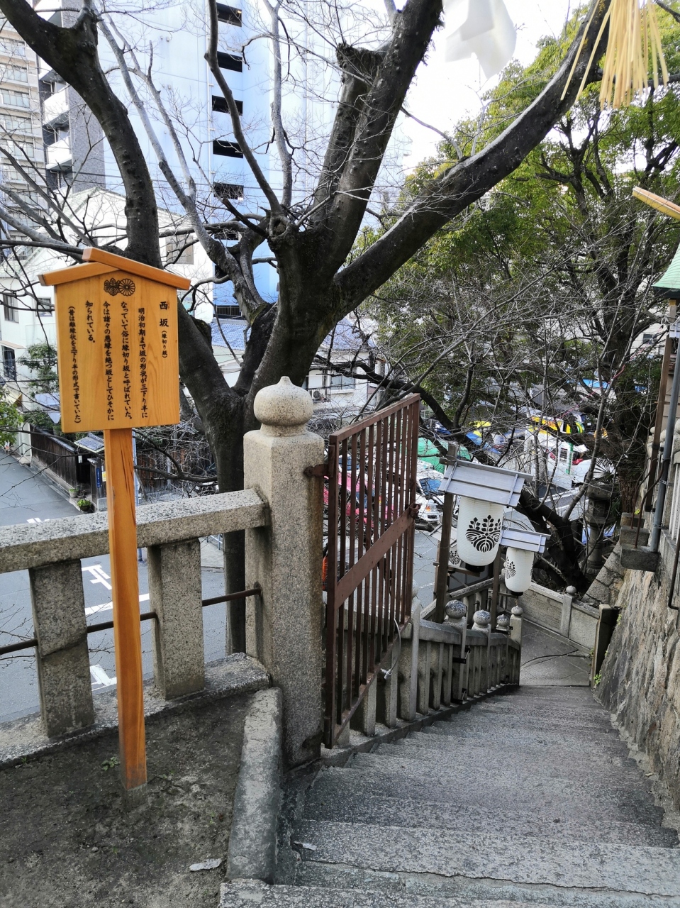 高津宮の本殿の西側にあります。かつては3回半折れ曲がった(三下り半)下り坂になっていて、この名称になったそうです。実際に芸妓が嫌な旦那と縁を絶つため日参したそう。ちょうど相合坂と対照なので、あるいみ一石二鳥ですね。