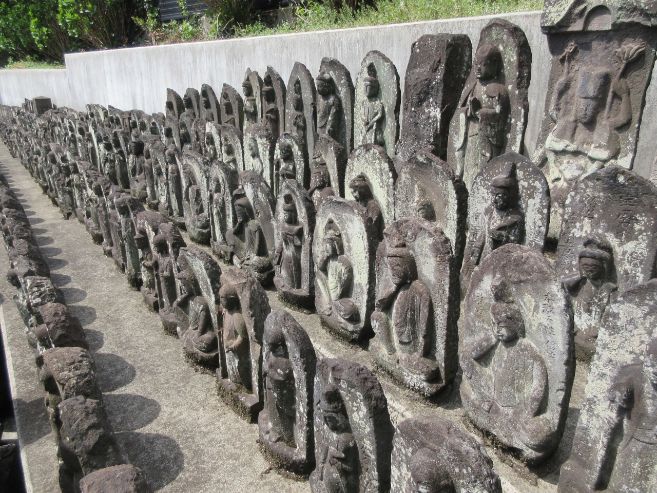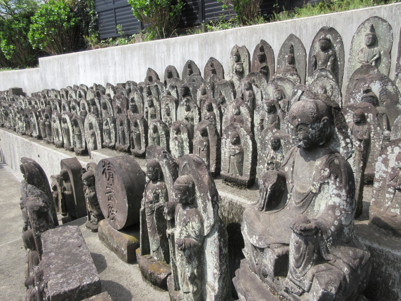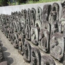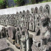 明治神宮前駅から明治通りを渋谷方向へ5分ほど歩いたところにある長泉寺の墓地にあります。説明板は山門を入った右にあります。本堂の左奥に広い墓地があり、JR線路脇に六地蔵尊、年号と戒名が彫られた多くの墓石、多くの地蔵尊や聖観音像などが並んでいます。どれもよく見ると年号が彫られていて古いものであることがわかります。この付近にあった民間で作られたものがここに集められたと説明板に記されています。石仏群の前に大きな地蔵尊や歴代住職の墓石が並んでいて、石仏群が大切にされていることがわかりました。