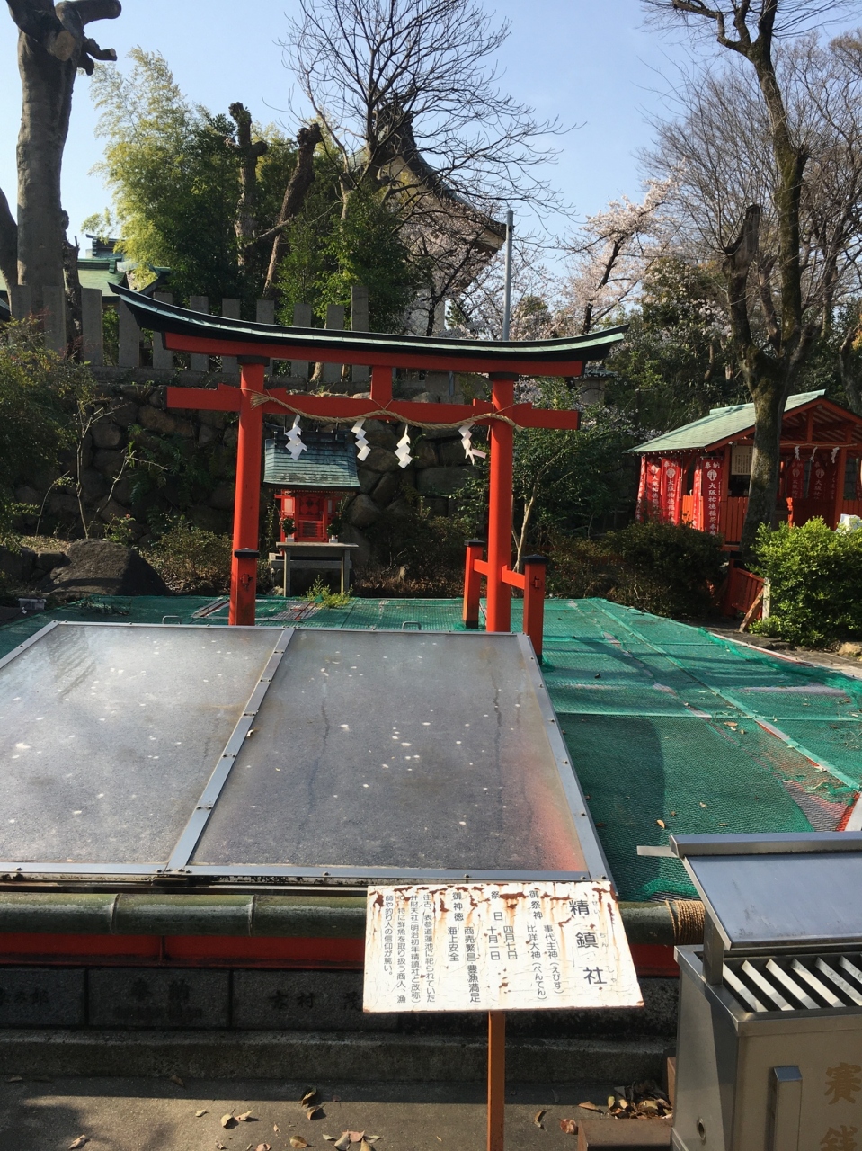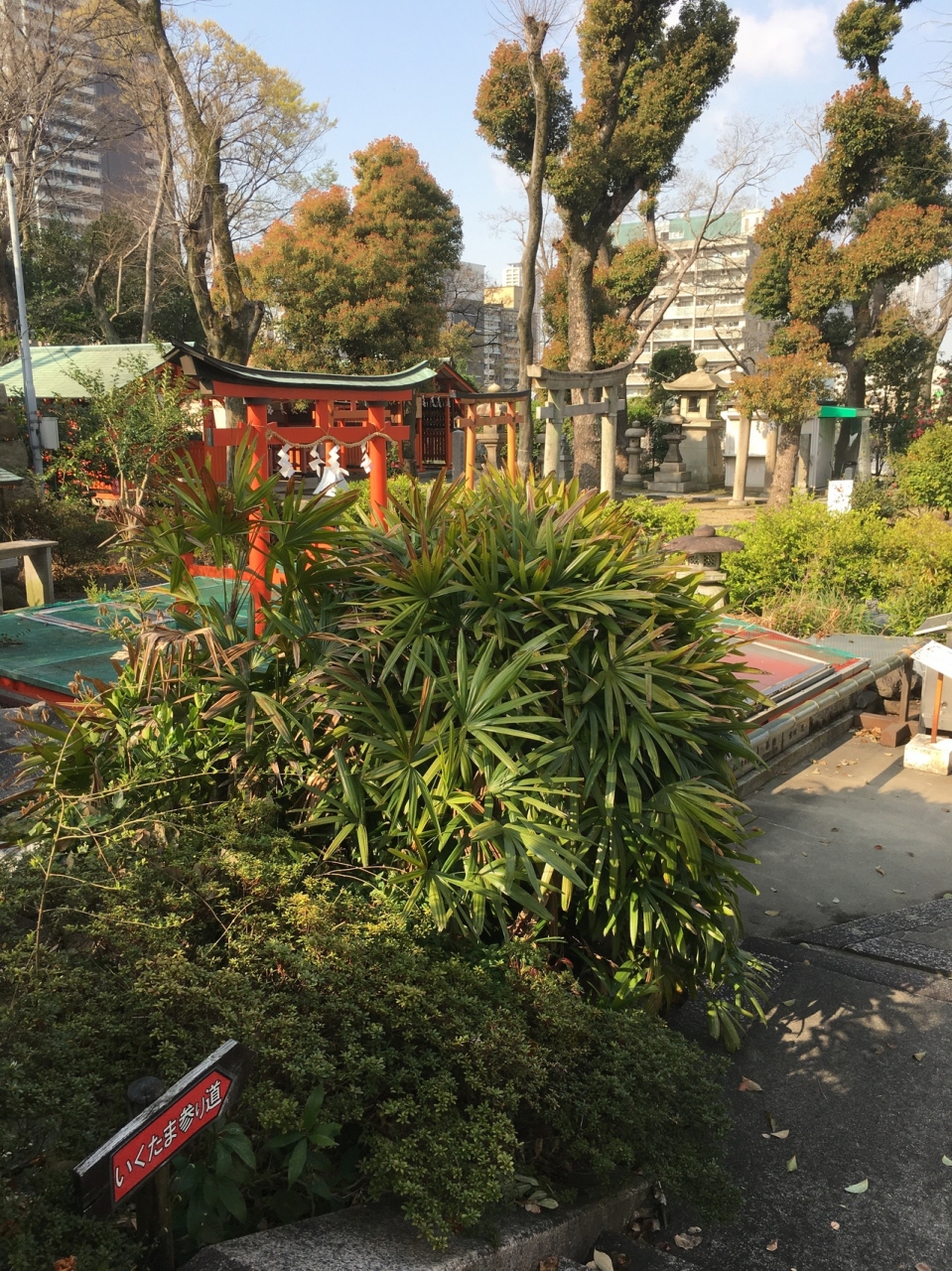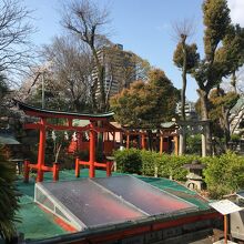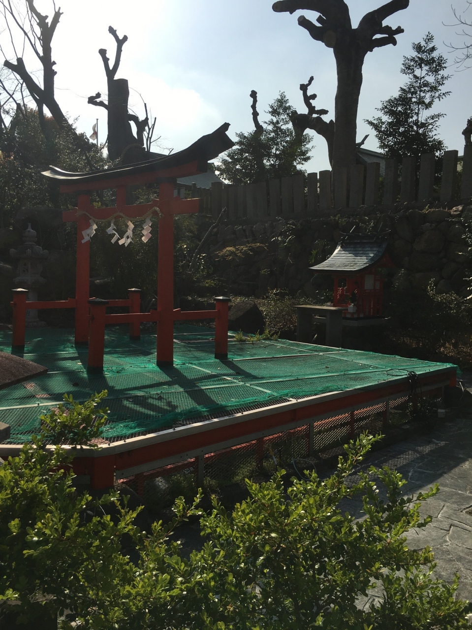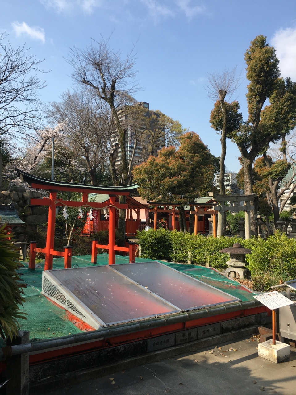 鮮魚を取り扱う商人や釣り人、漁師の信仰があり、鳥居は池の中に建っていましたが、池には緑の網が掛けてあり魚がいるか分かりませんでした。池の後方に祠がありましたが、池があるため近くまで行けず脇道を通って参拝しました。