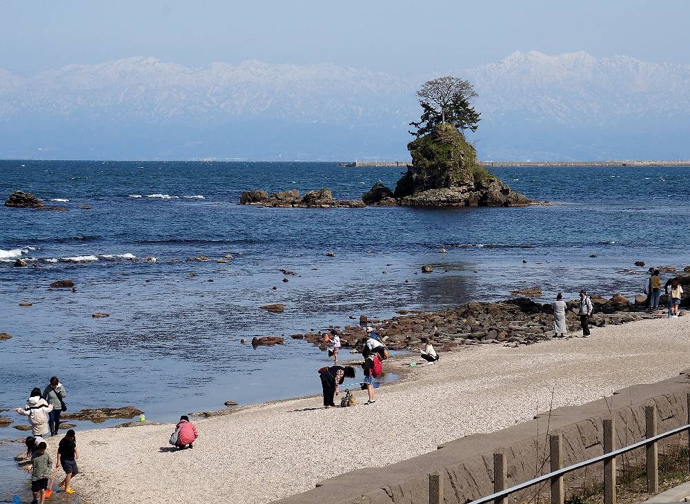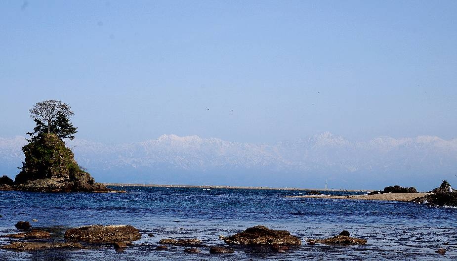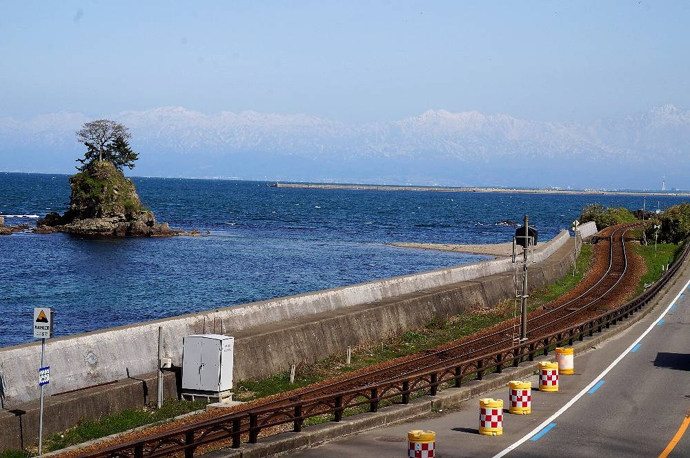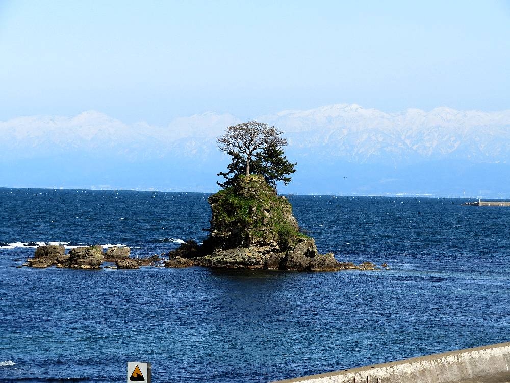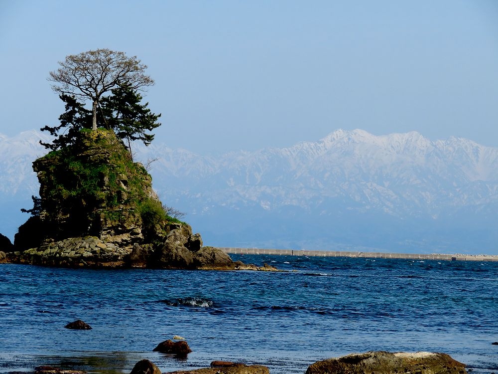 桜の季節に合わせて、訪れました。女岩を中心に海越しに見える冠雪した立山連峰の景色に憧れ、長年の夢を実現すべく、胸躍らせて行きましたが、数日前の黄砂の影響か、快晴にも関わらずクリアには見えませんでした。ここは冬の空気が澄んだ日を選んで、訪れるところだと思いました。雨晴(あまはらし)という名のいわれとなった義経岩の存在も知らずに来たので、
