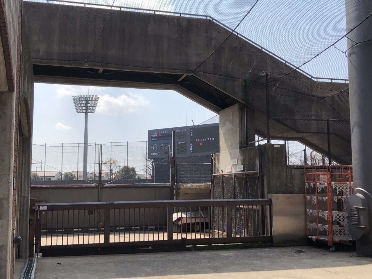 小田急線の桜ヶ丘駅から歩いて10分、引地台公園の中に野球場(大和スタジアム)があります。2019年3月にスコアボードがリニューアルされ、フルカラーLEDの明るい表示になりました。