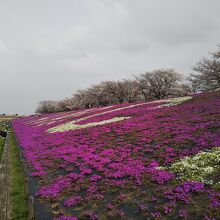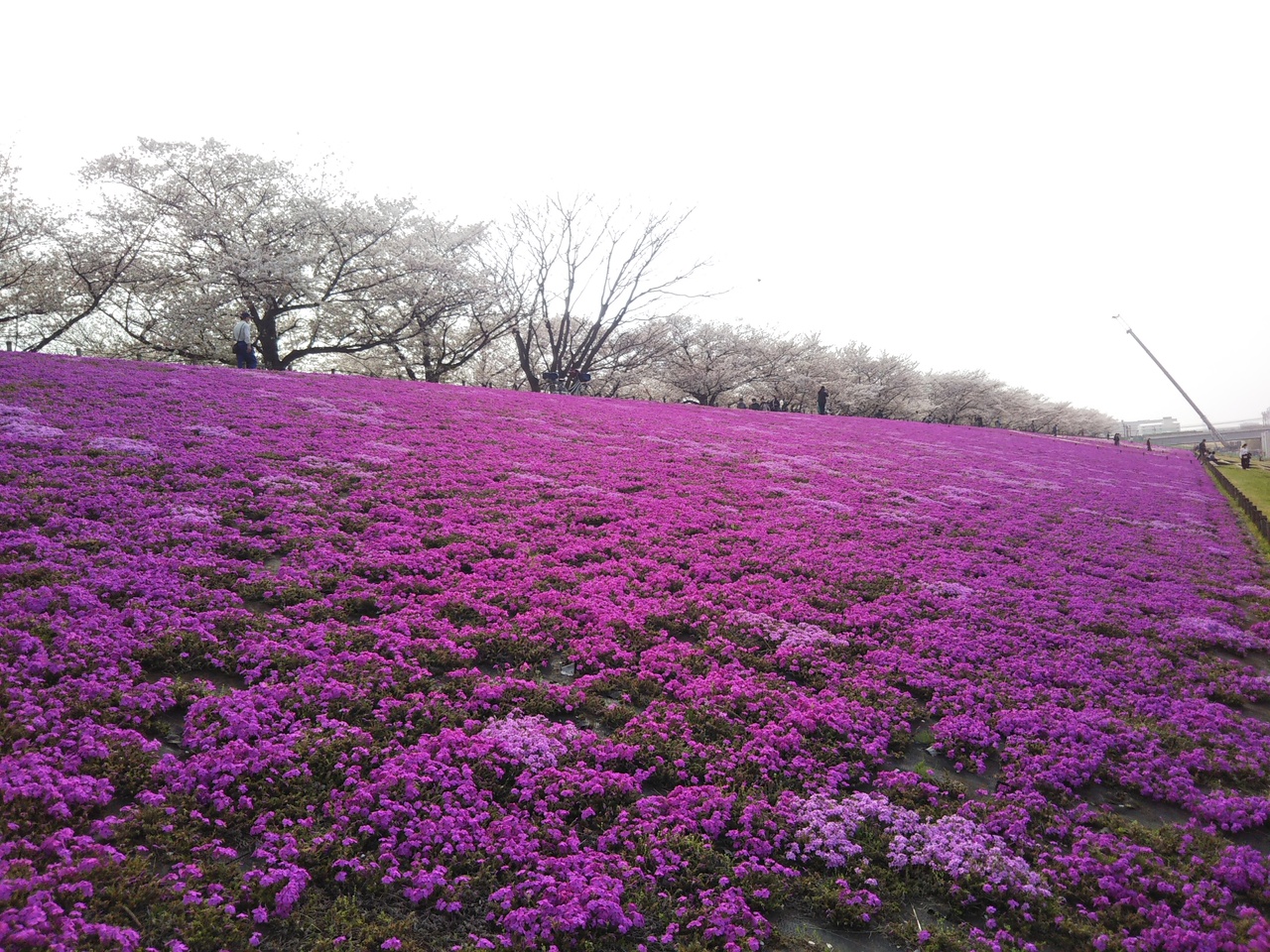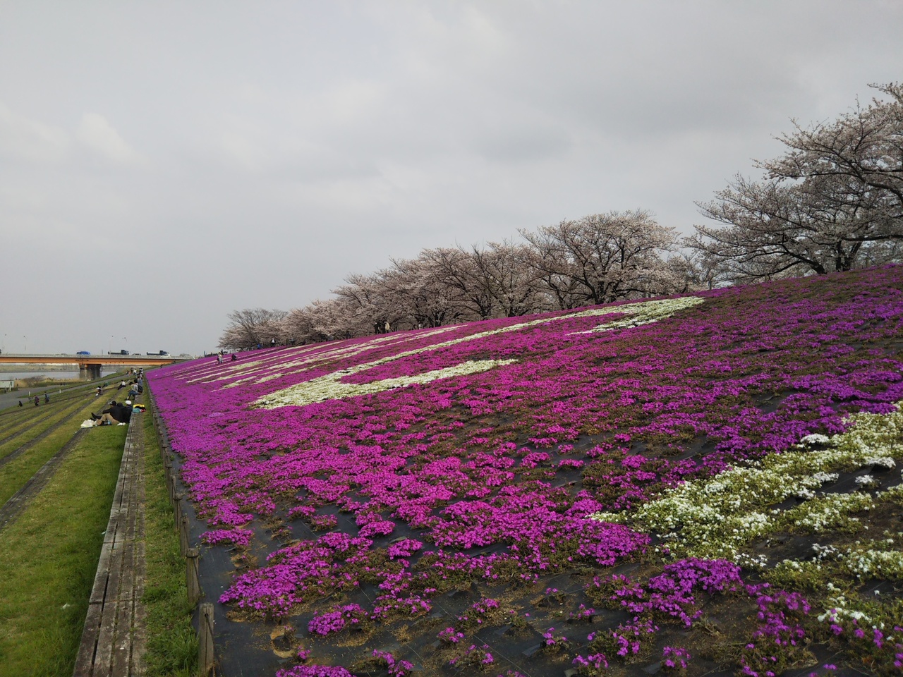以前は無かったとおもうのですが いつの間にか土手の斜面に芝桜が植えられ 春には鮮やかなピンクの絨毯を見ることができます。一部段々になっている場所があり 腰掛けてのんびりと川や電車、草野球してる人を見ながらのんびりできます。