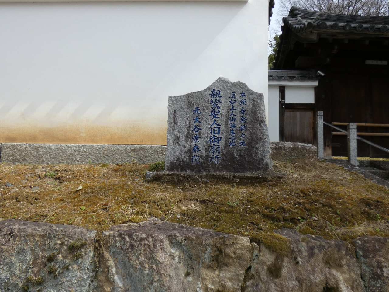 浄土宗総本山知恩院三門と黒門の間に建つ塔頭寺院。本尊は「八ツ藤阿弥陀如来」。1272年親鸞聖人の末娘が・覚信尼がこの地に廟堂を創建し遺骨を納めたのが始まりで、3代覚如が寺を創建して本願寺としたそうです。後に移転しますが本願寺発祥地、また第8代蓮如上人誕生地でもあります。山門前にその石碑が建っています。