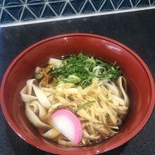 だしの薄い真っ茶色の出汁にきしめん、刻んだ揚げにかまぼこにネギ