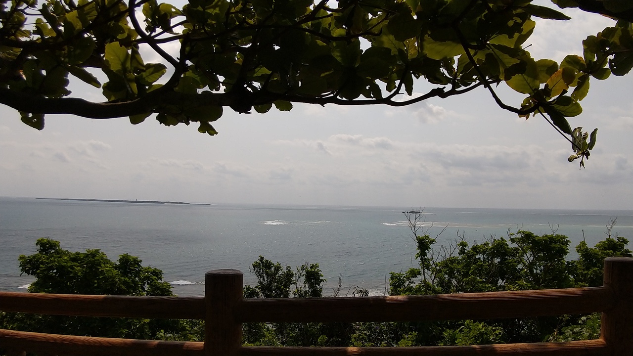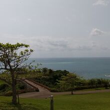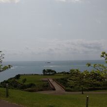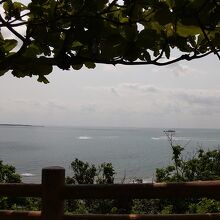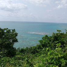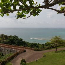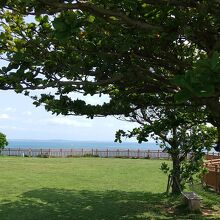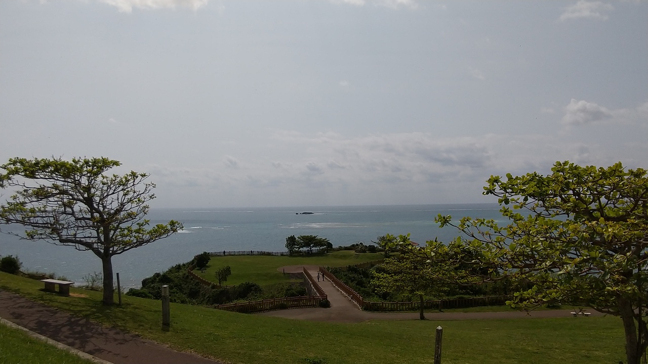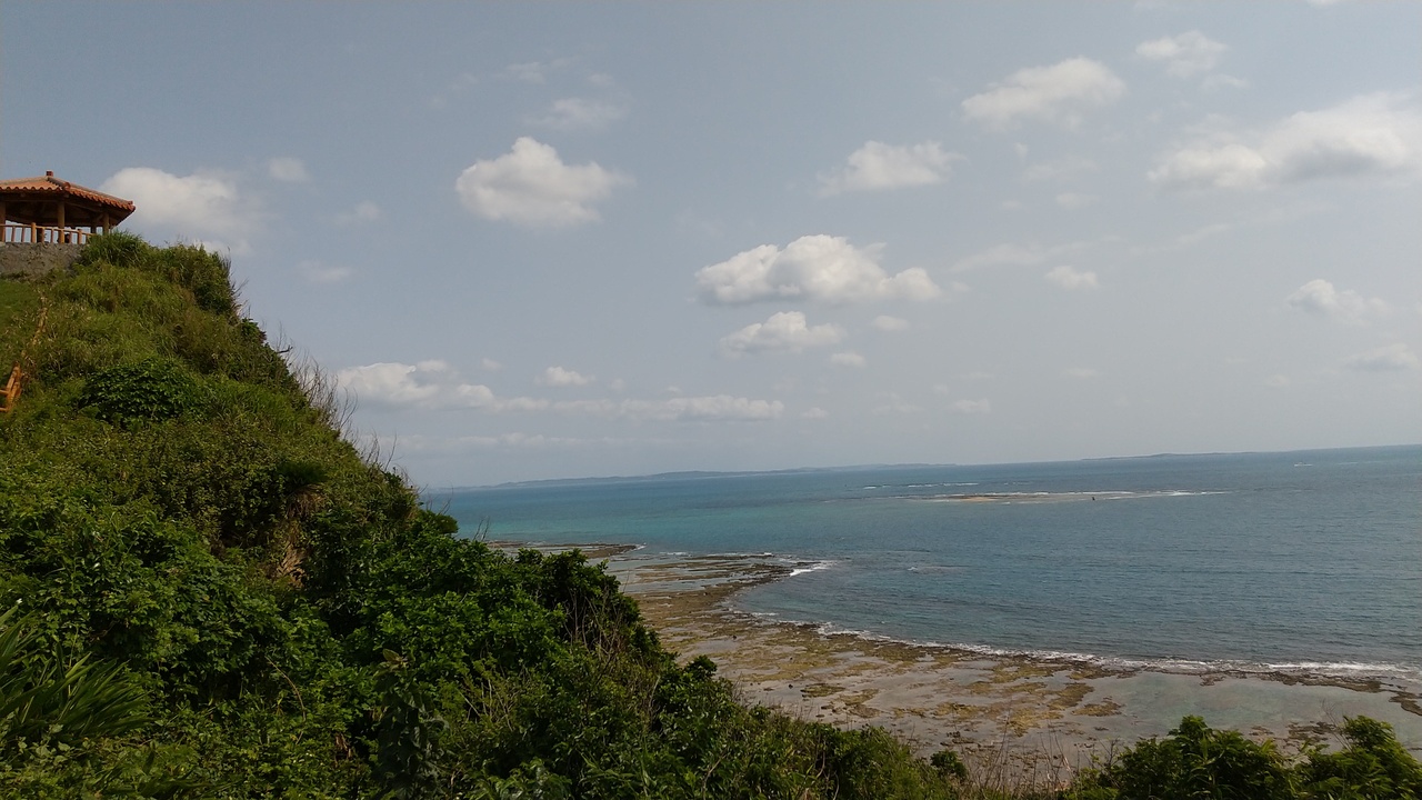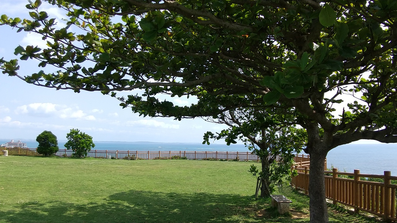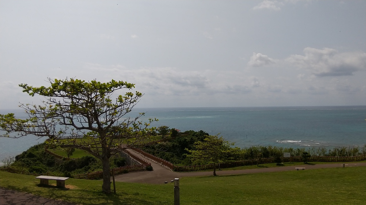 東屋から眼下に広がる美しいコバルトブルーの海が見渡せます。階段で下に行くと岬一帯が公園になっていて遊歩道を散歩。