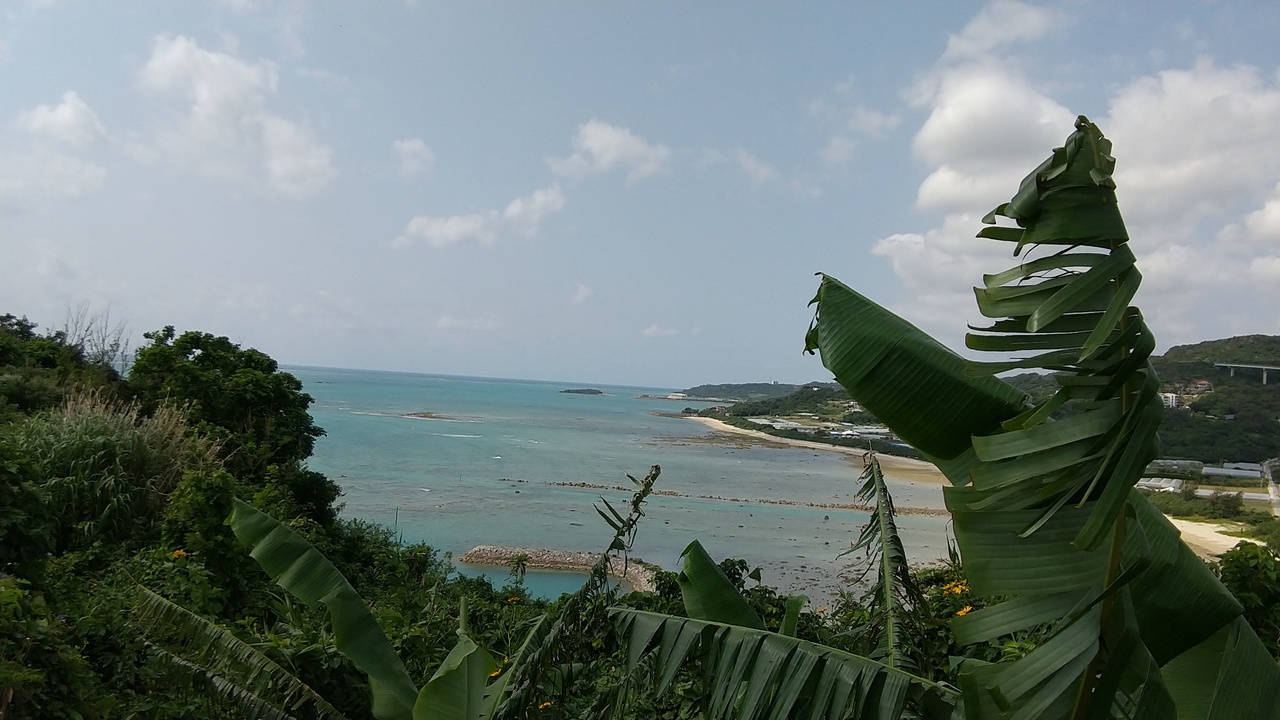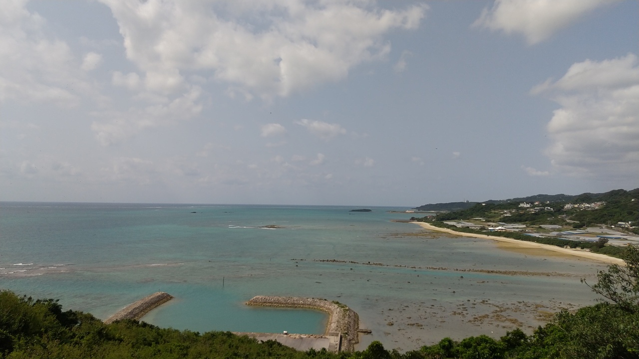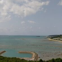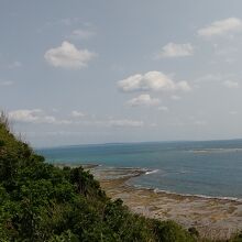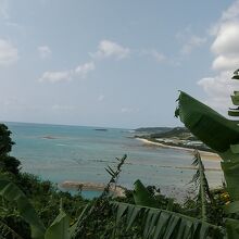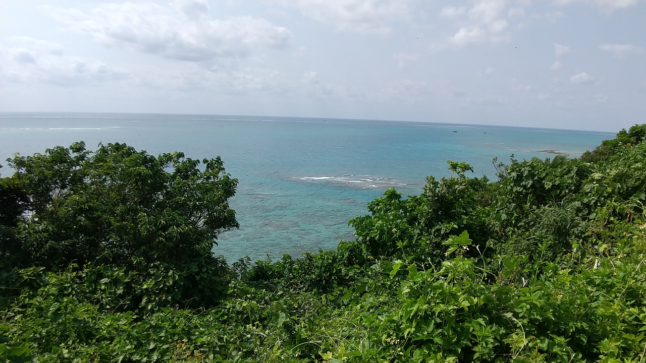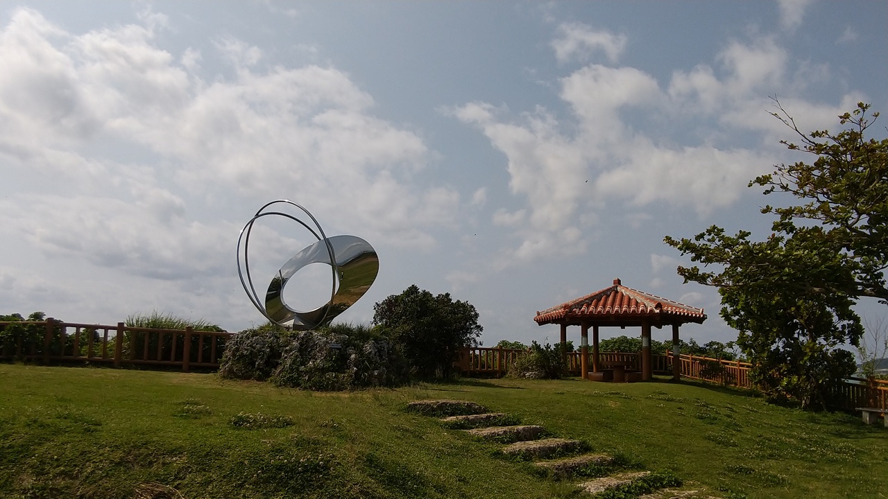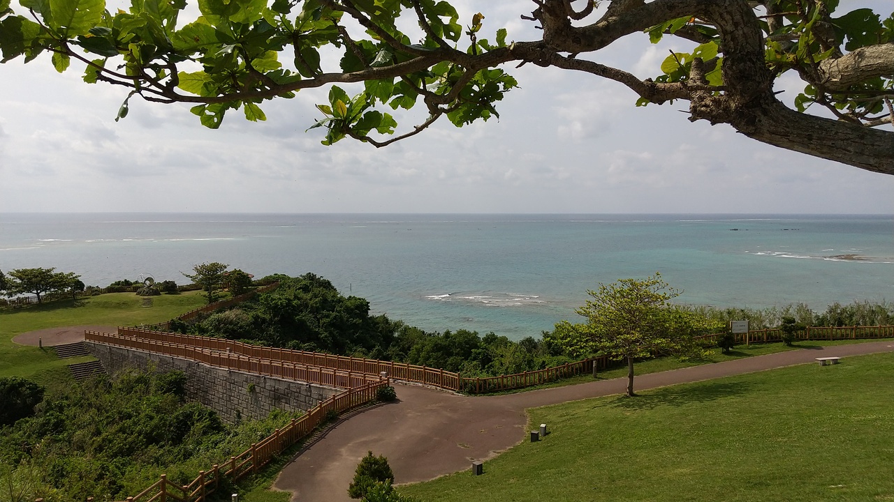 東屋から眼下に広がる美しいコバルトブルーの海が見渡せます。階段で下に行くと岬一帯が公園になっていて遊歩道を散歩。