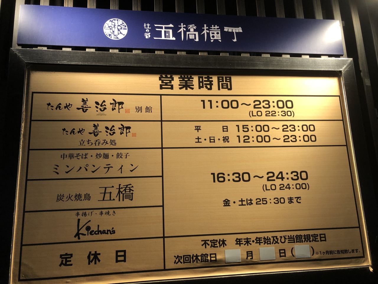 牛タン、炭火焼鳥、串揚げ、中華の4店舗とたんや善次郎の立ち飲み処がある。