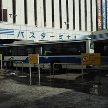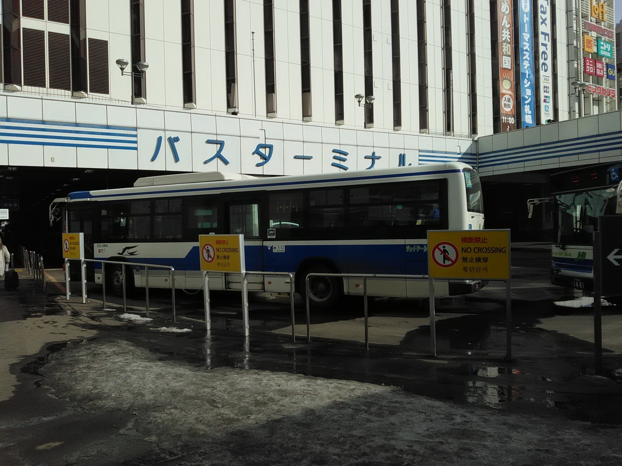 白、青基調のバス、バスターミナル、駅直結なのですが、一回 外に出てから戻っていくとわかりづらい、たどり着くのにちょっと迷いました。沢山の路線があることもあり、バスの発車時刻前に余裕を持って行ったほうがよいです。結構ごちゃごちゃしていますね。