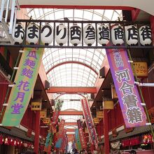 アーケードがあるので雨の日でも安心、アーケードが明るいので商店街の雰囲気も明るいです。