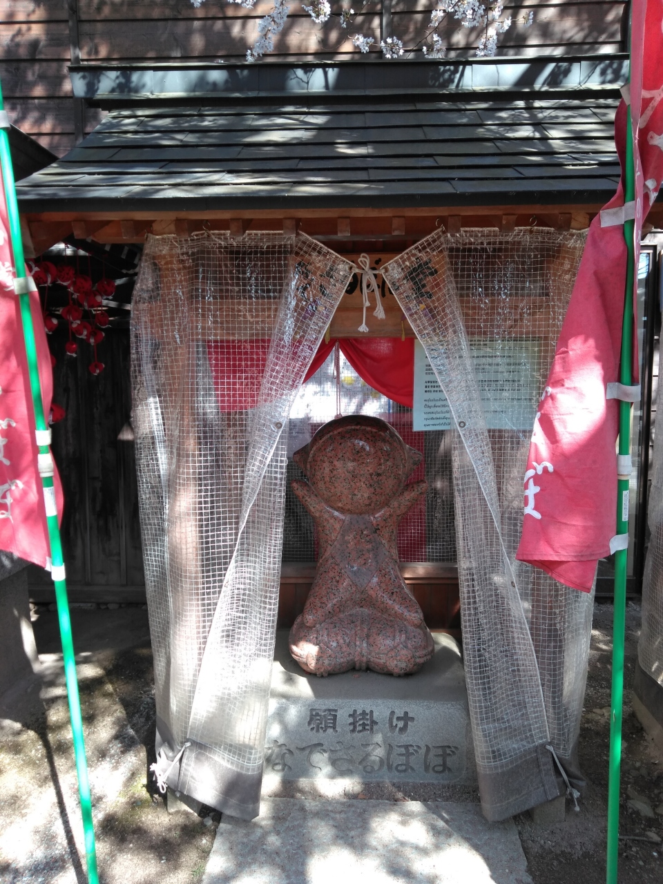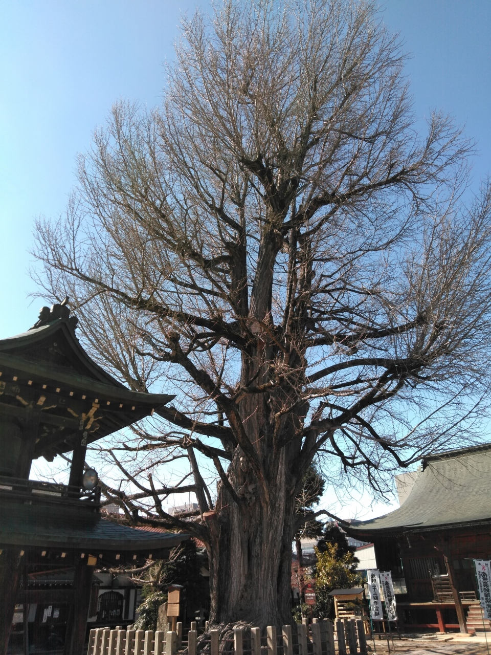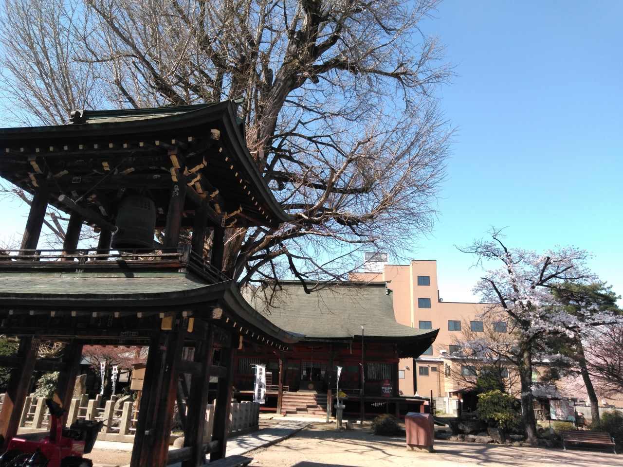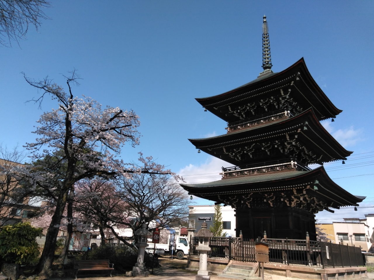 車は、境内に数台停められます。大イチョウで有名ですが、本堂、表門、三重塔の歴史を感じる建物と、可愛い願掛けなでさるぼぼ等の、見所が多いです。大イチョウは、まだ葉も出ていませんでしたが、咲き始めた桜と三重塔とのツーショットが素敵でした。