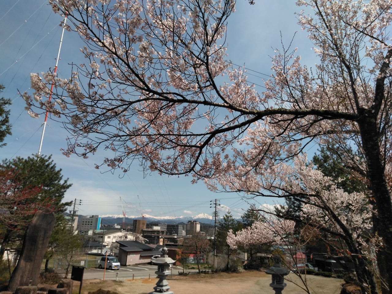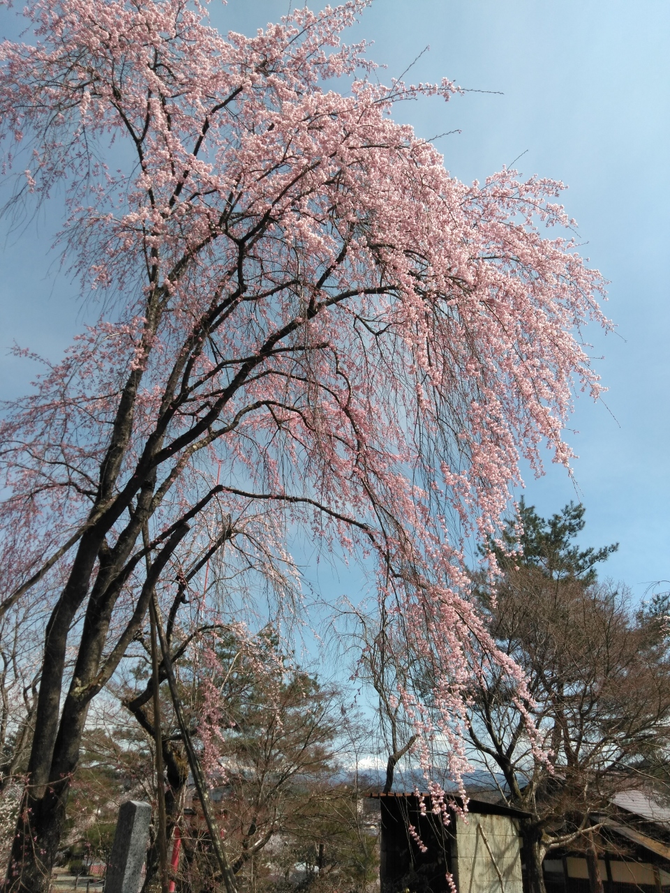 2021年4月6日、某桜の開花情報サイトで「桜が満開」とあったので行ってみました。周辺に無料の駐車場があります。桜の本数は多くなく、しだれ桜もありましたが、お花見スポットという感じではありませんでした。階段の上の本堂が立派でした。北アルプスが見えました。