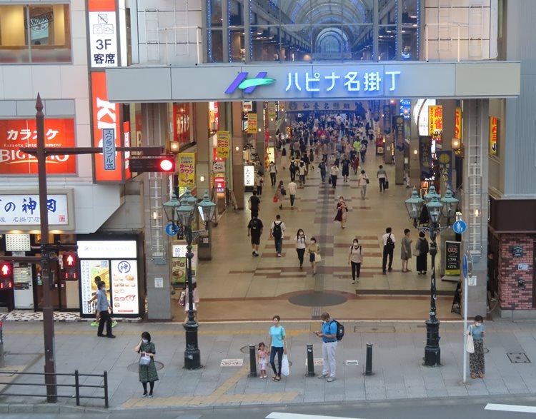 俯瞰してみると仙台はアーケード街がとても発達した街のようです。なかでも仙台駅からもっとも近いアーケード商店街がこのハピナ名掛丁で、駅前通りから愛宕上杉通りを横切って西へ伸び、引き続きアーケード商店街、クリスロードに接続しています。歩行者専用道になっていて、多くの人で賑わっていました。
