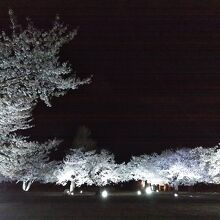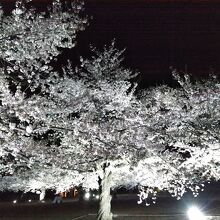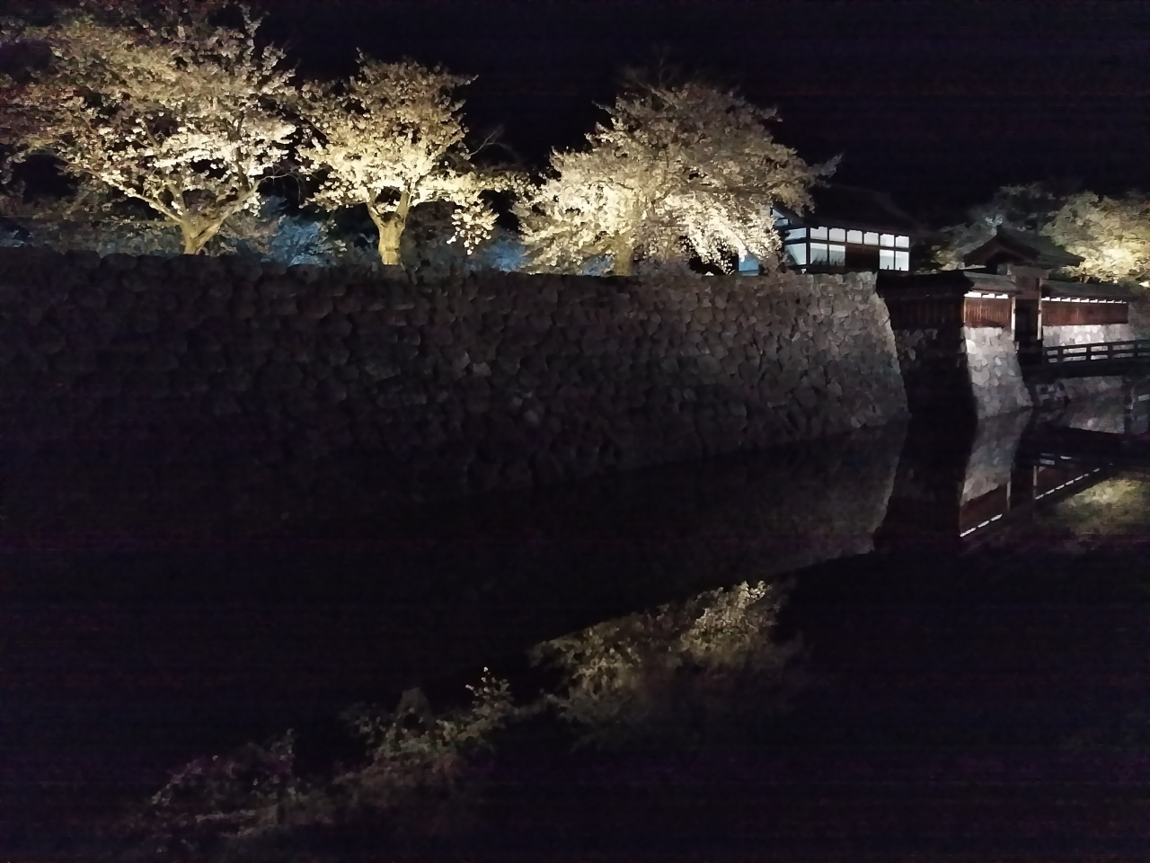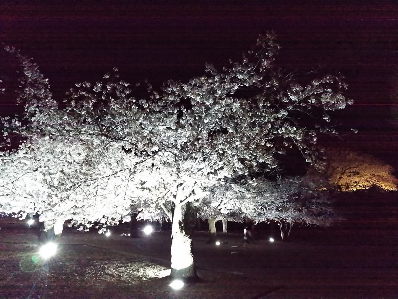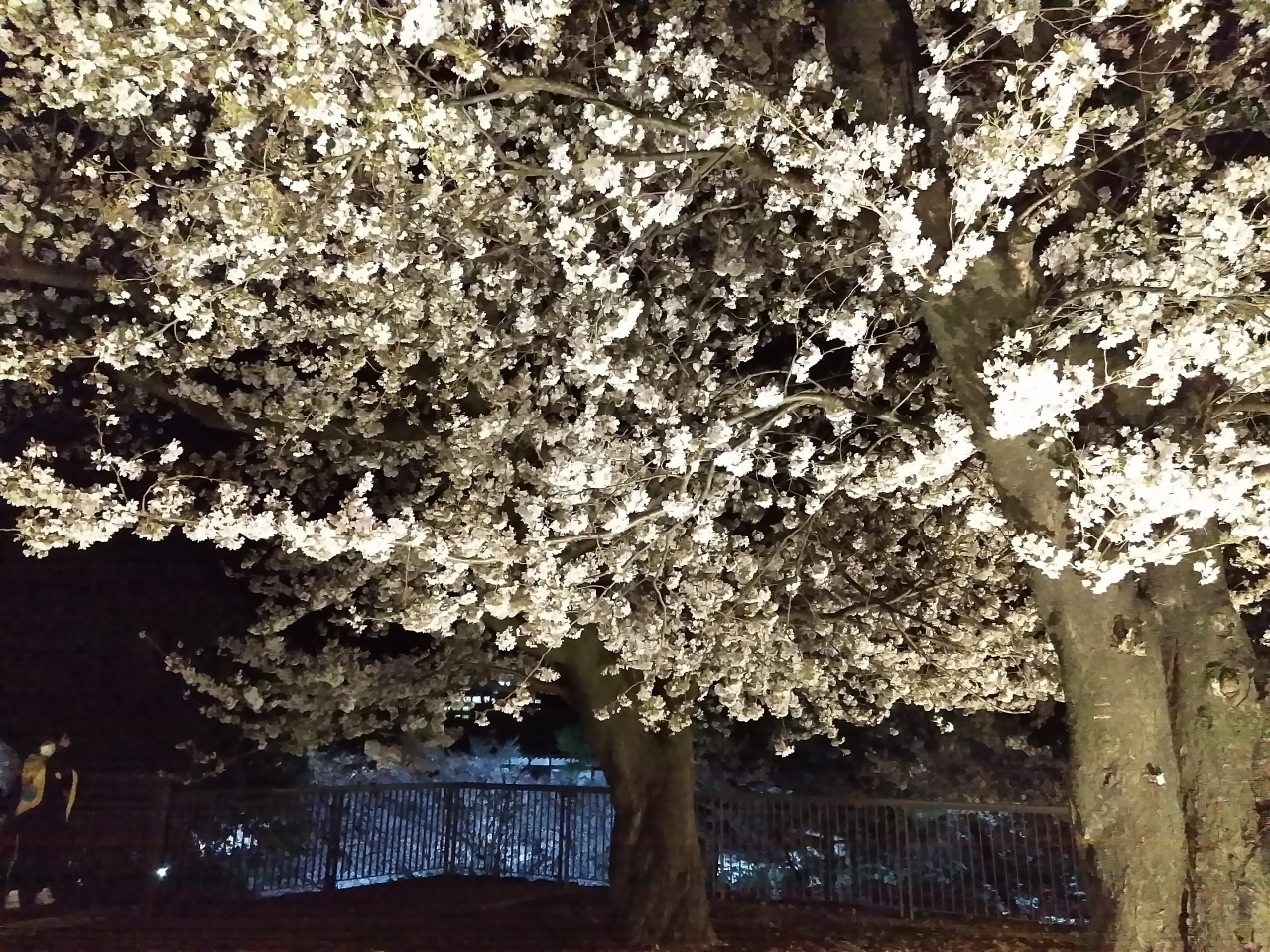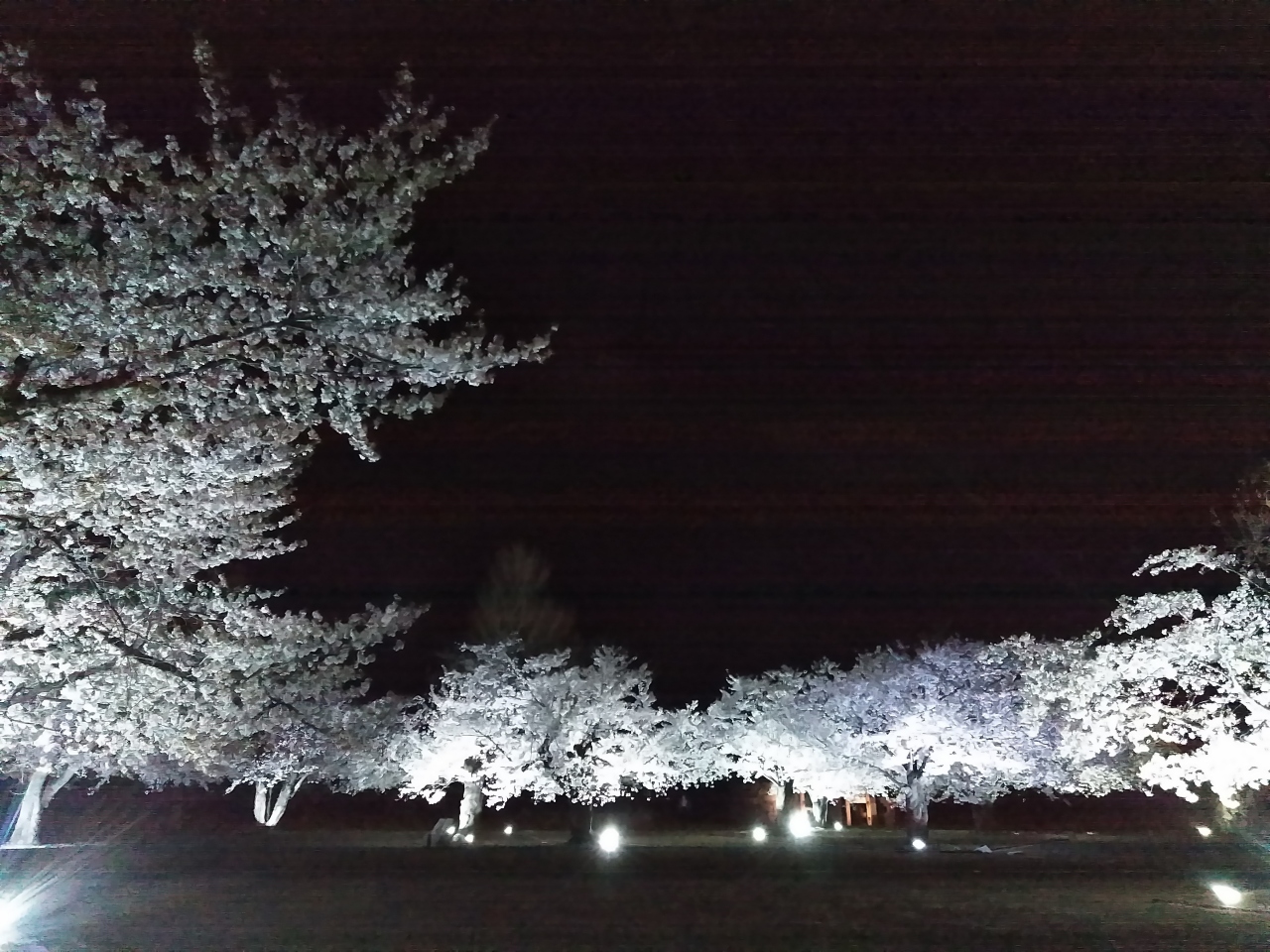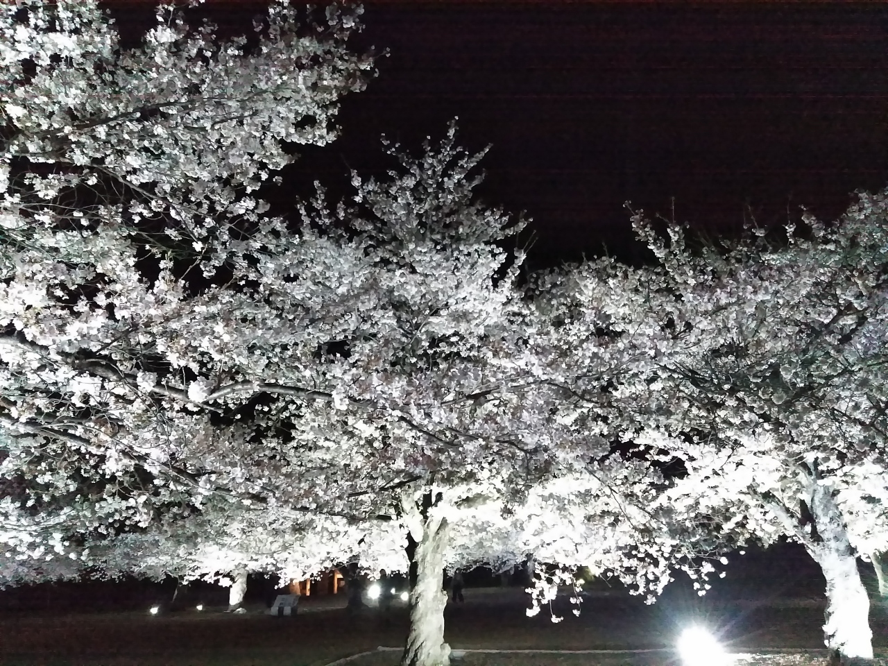 以前も行って良かったので、2021年4月6日、某桜の開花情報サイトで「満開」との事で行ってみました。無料の広い駐車場があります。桜の本数はあまり多くありませんが、白いライトアップが見事で、幻想的な雰囲気がとても素敵です。櫓上の桜も綺麗です。