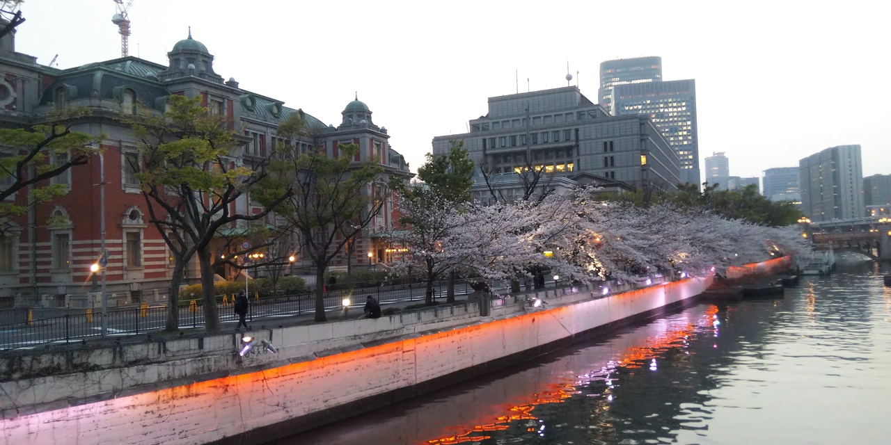 中之島遊歩道は、大阪市の梅田や淀屋橋に近い中之島の河川沿いに設けられた歩行者専用道路です。東は大阪市中央公会堂あたりから、西は国際会議場を過ぎて新なにわ筋あたりまでの、主に北側の川沿いの道です。春は桜がキレイですね。
