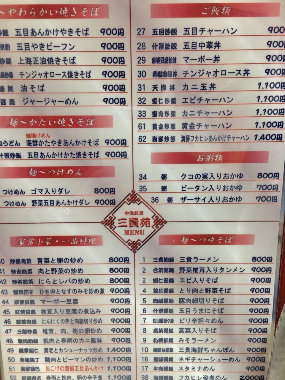 たくさんあるメニューから三貴ラーメン800円を注文しました、厨房にいる二人のコックさんは中国出身の方のようです