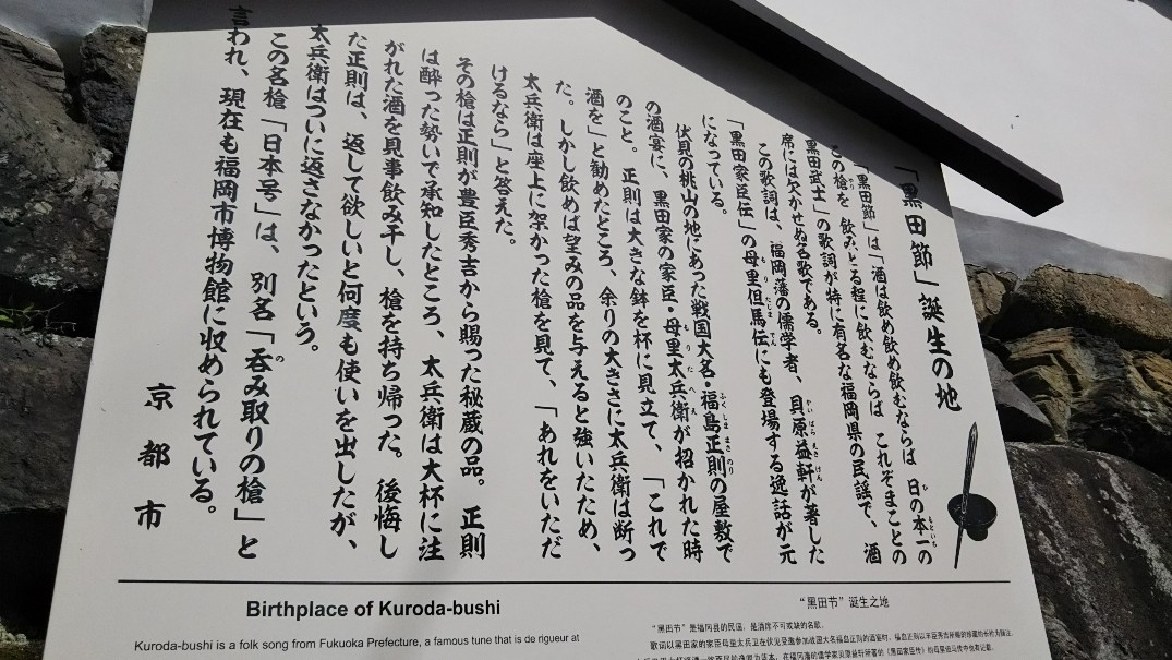 場所は駅から御香宮神社へまっすぐ続く道の途中にあった。ほぼ神社の手前あたり。で、黒田節っていうの無知だから初めて知ったんだけど、その「飲めよ~」っていうセリフは福岡の民謡らしいけど地元の人はみな知ってるの?