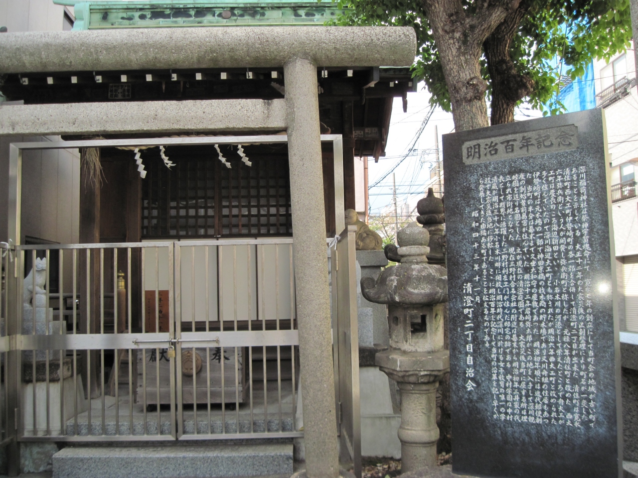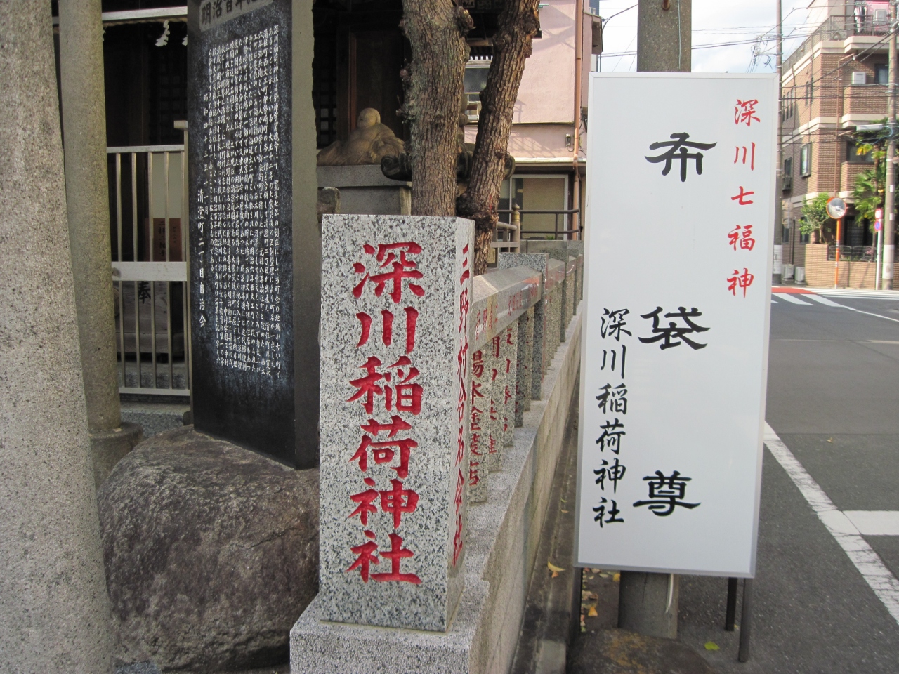 周辺を散歩していて住宅街の中で見つけました。ほんとうに小さな神社で、見過ごしてしまいそうですが、布袋尊の旗が立てられていたので、気が付きました。この辺りは江戸時代からの下町で、布袋尊は深川七福神のひとつだそうです。清澄白河駅からは近い場所です。