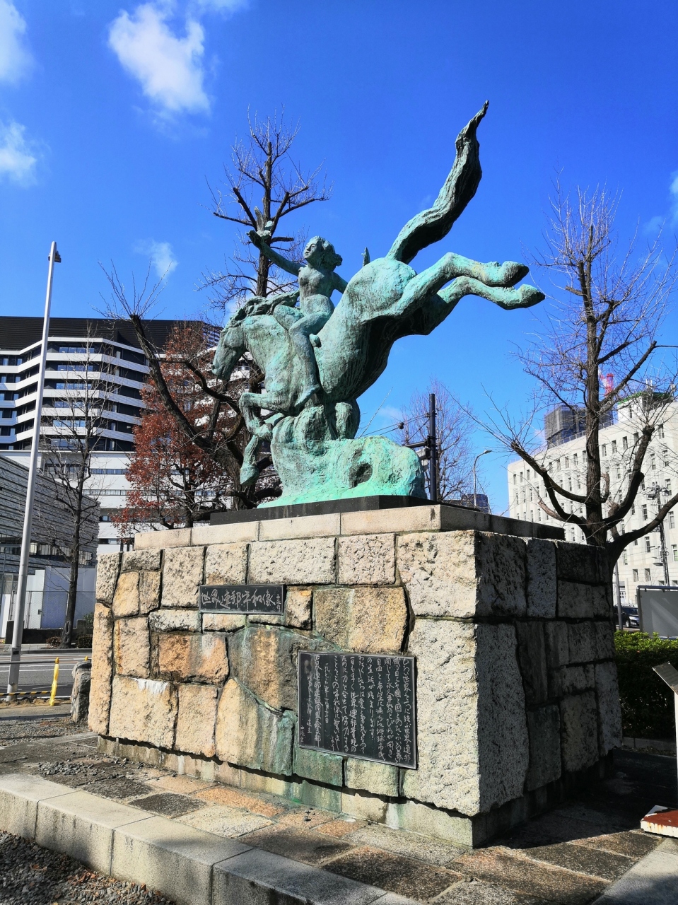 大坂城の西側の出入り口である大手門の側の交差点から入ってすぐのところにあります。長崎平和祈念像の作成者でもある北村西望によるもので立派な像です。なぜここなのかはイマイチよくわかりませんが、各国からの訪問者も多い場所なので、平和像にはいいかもしれませんえ。