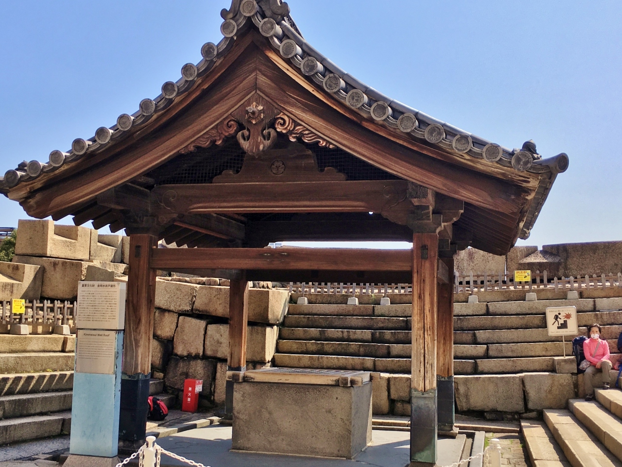 大阪城天守閣へと階段を登って行く途中、大砲の近くにあります。小さな屋根の中に井戸があります。天守と同じ1626年に創建され、重要文化財に指定されています。天守閣に一番近い井戸とのことで、金明水と名がついたそうです。井戸なので中を覗き込んでみましたが、格子状の蓋で覆われ暗くてよく見えませんでした。もう一つ、桜門のそばに「銀明水の井戸の井筒」がありますが、こちらは移設されたため文化財指定になっていません。