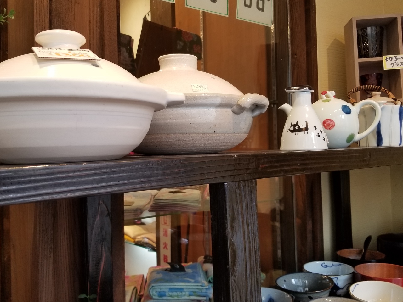 江戸きりこ硝子のおちょこやグラス、お茶碗や湯呑み、箸にマグカップなどおいてあり値段もリーズナブルだ。