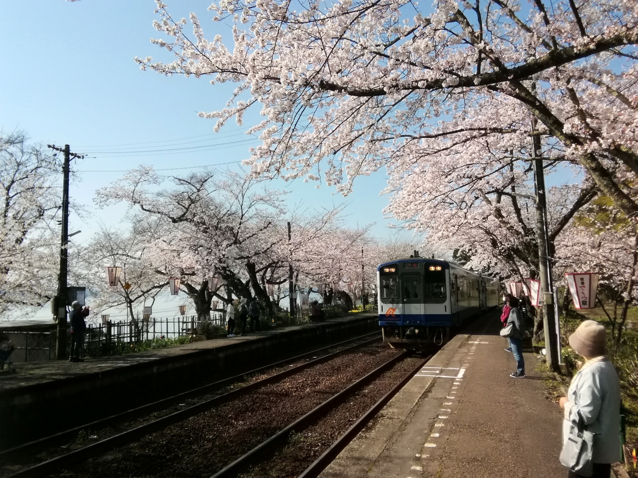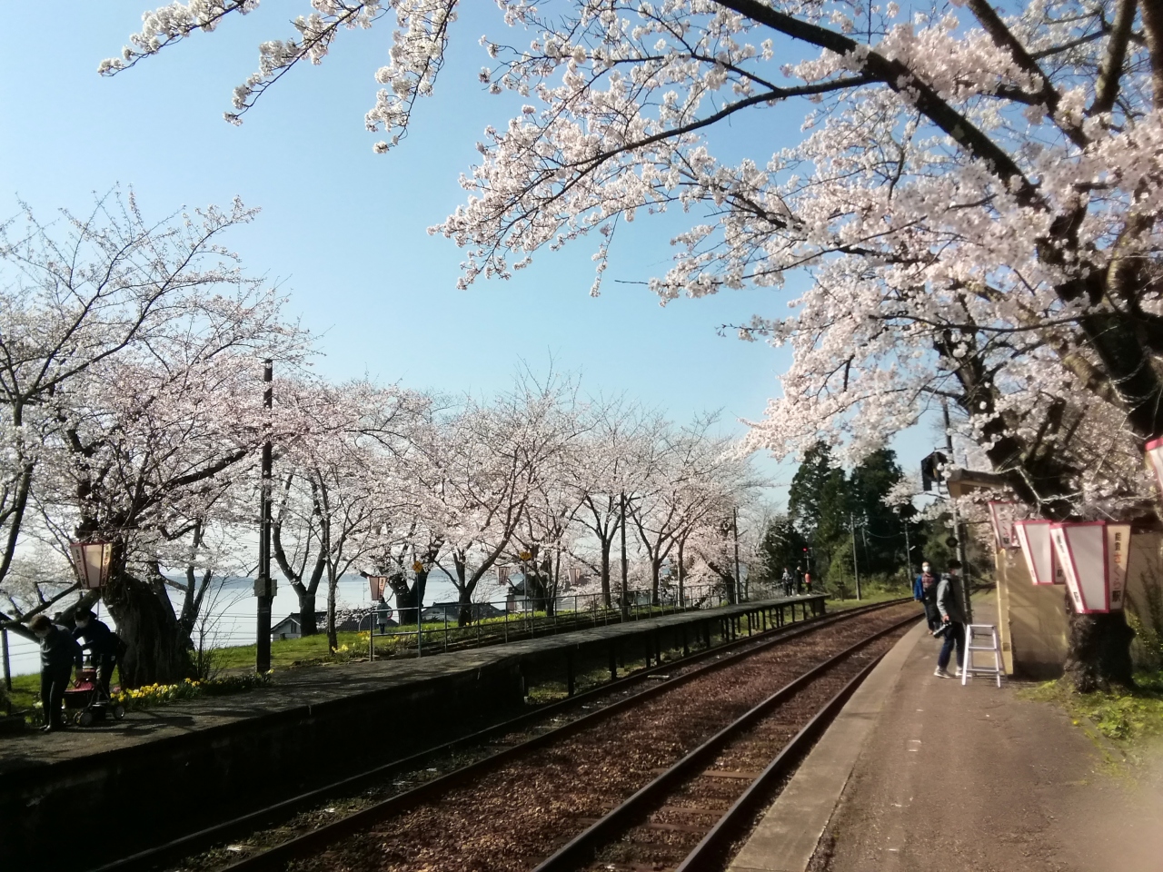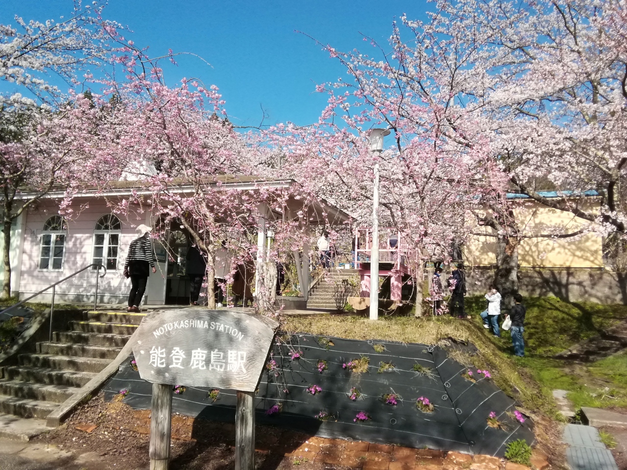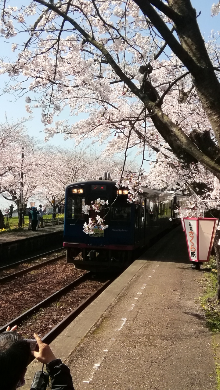 のと鉄道能登鹿島駅(能登さくら駅)の構内には約100本の桜が植えられ、桜の見頃のこの時期になるとプラットフォームの両脇の桜による桜のトンネルが楽しめます。今回、天候にも桜にも恵まれ最高の花見ができました。列車が通るたびに桜の花との共演が楽しめます。