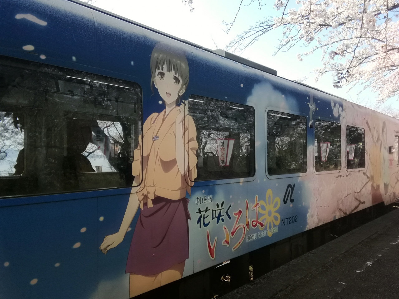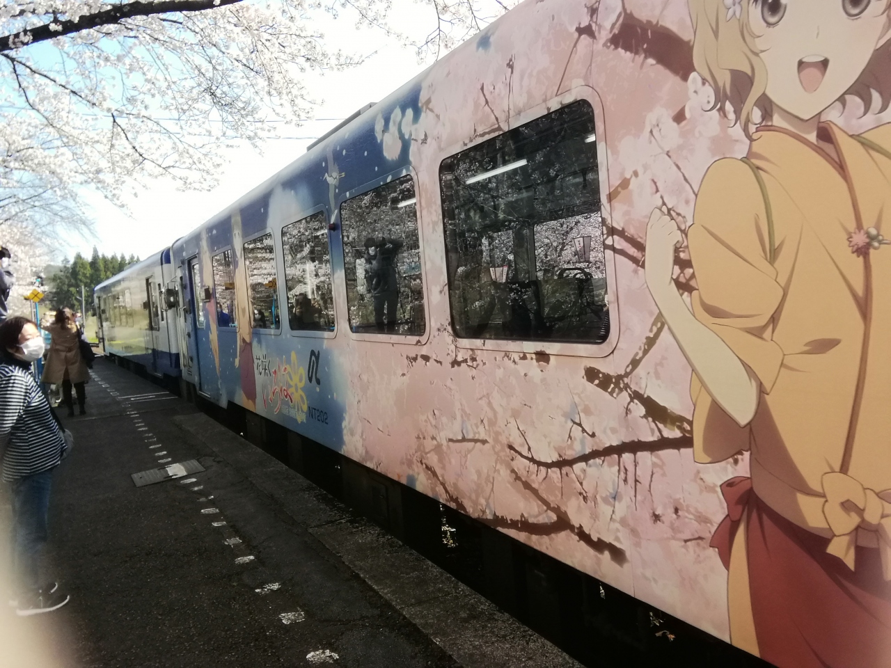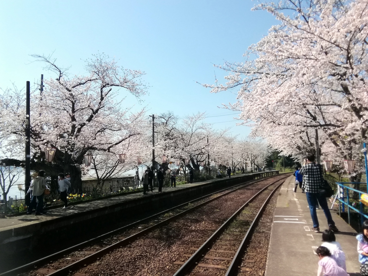 のと鉄道能登鹿島駅(能登さくら駅)の構内には約100本の桜が植えられ、桜の見頃のこの時期になるとプラットフォームの両脇の桜による桜のトンネルが楽しめます。今回、天候にも桜にも恵まれ最高の花見ができました。列車が通るたびに桜の花との共演が楽しめます。