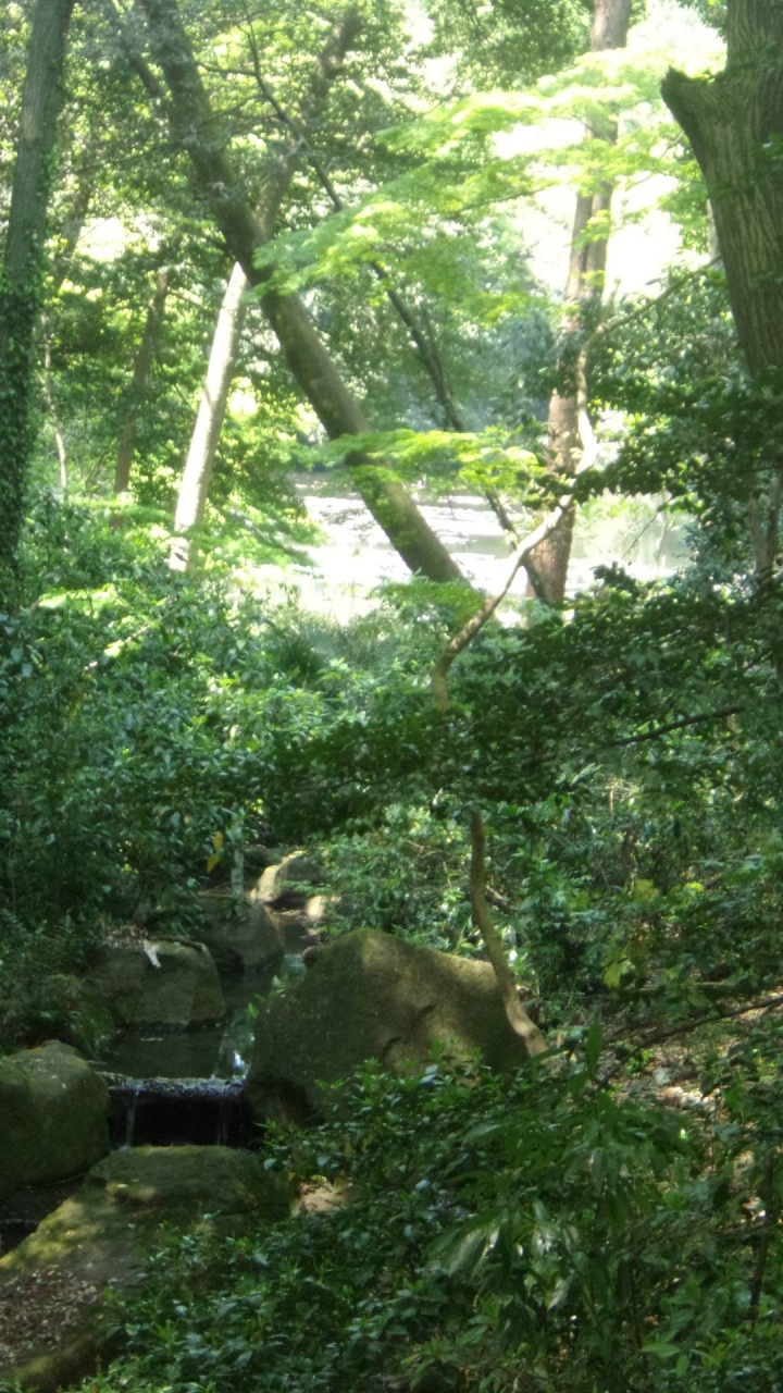 JR原宿駅前の神宮橋から表参道を本殿に向かうと、玉砂利の参道は南参道の下り坂になって神橋でせせらぎを渡る。この神橋の上から上流を望むと、御苑内の「南池」を見ることができる。(500円払って御苑に入れば、水際まで行ける。)