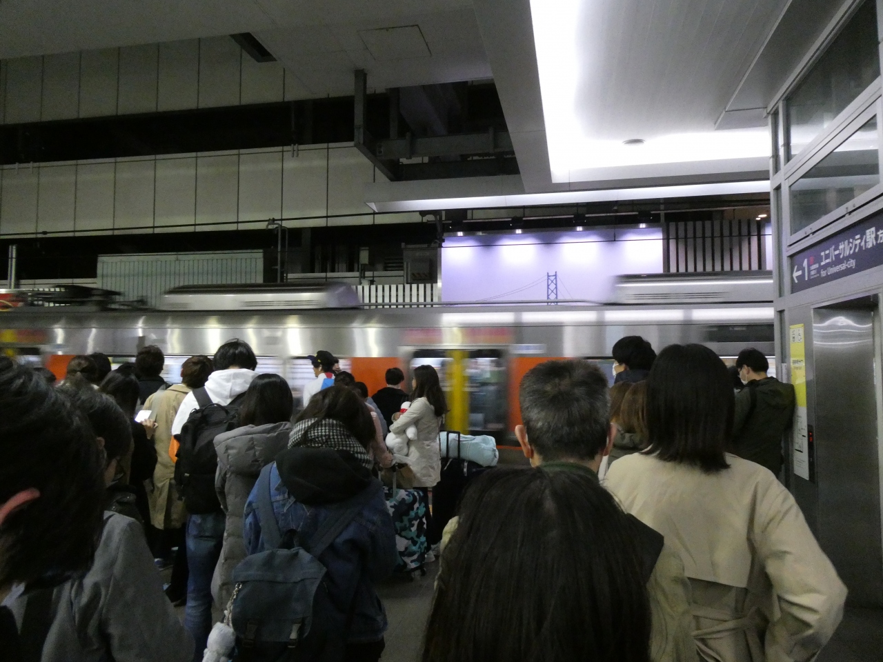 平日の夜ですがまだまだ乗車する人が多くホームも車内も賑わっていました。