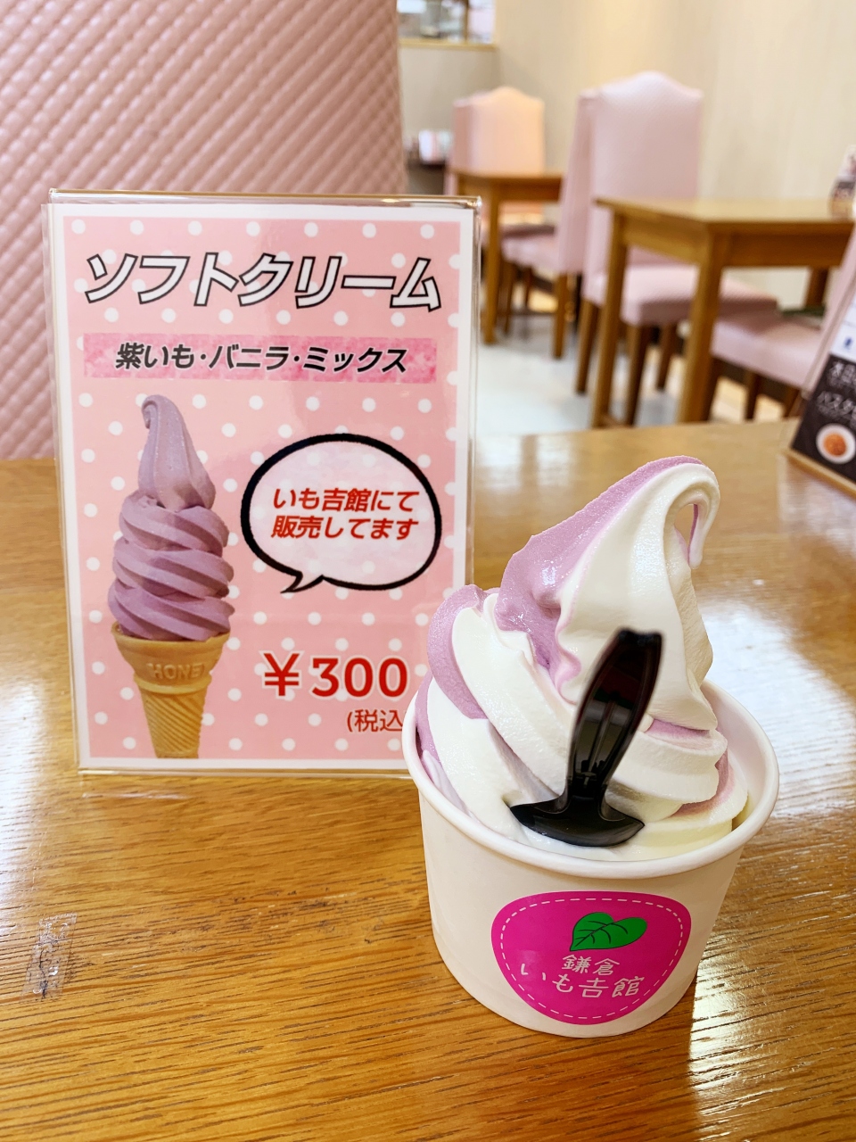 早速芋とバニラのソフトクリームを注文してイートインスペースでいただきました。