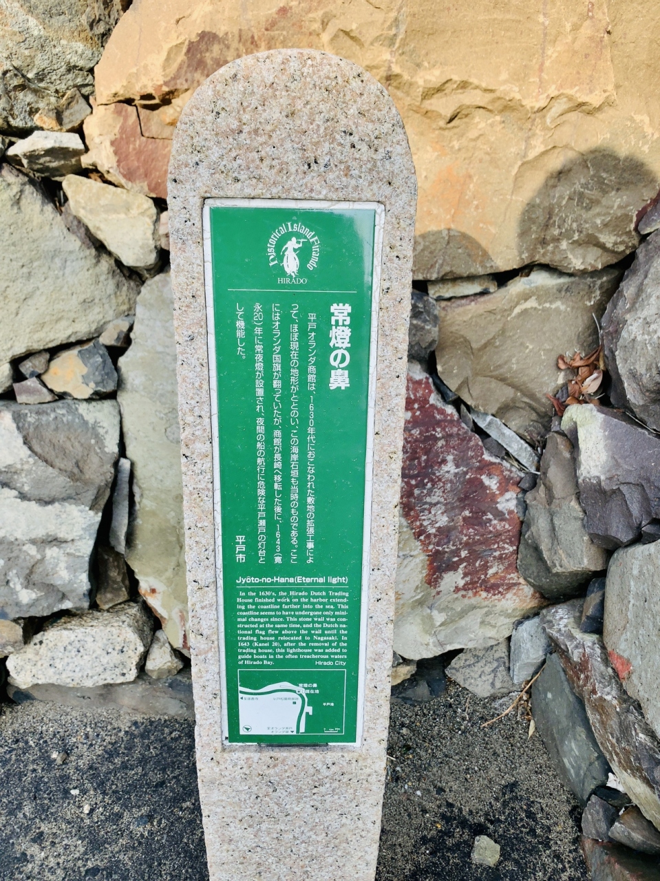 この海岸石垣は1630年代に行われた平戸オランダ商館の敷地拡張工事の当時のもので、ここにはオランダ国旗が翻っていましたが、オランダ商館が長崎へ移転した後に1643年に常夜灯として設置され、夜間の船の航行に灯台として機能していたそうです。