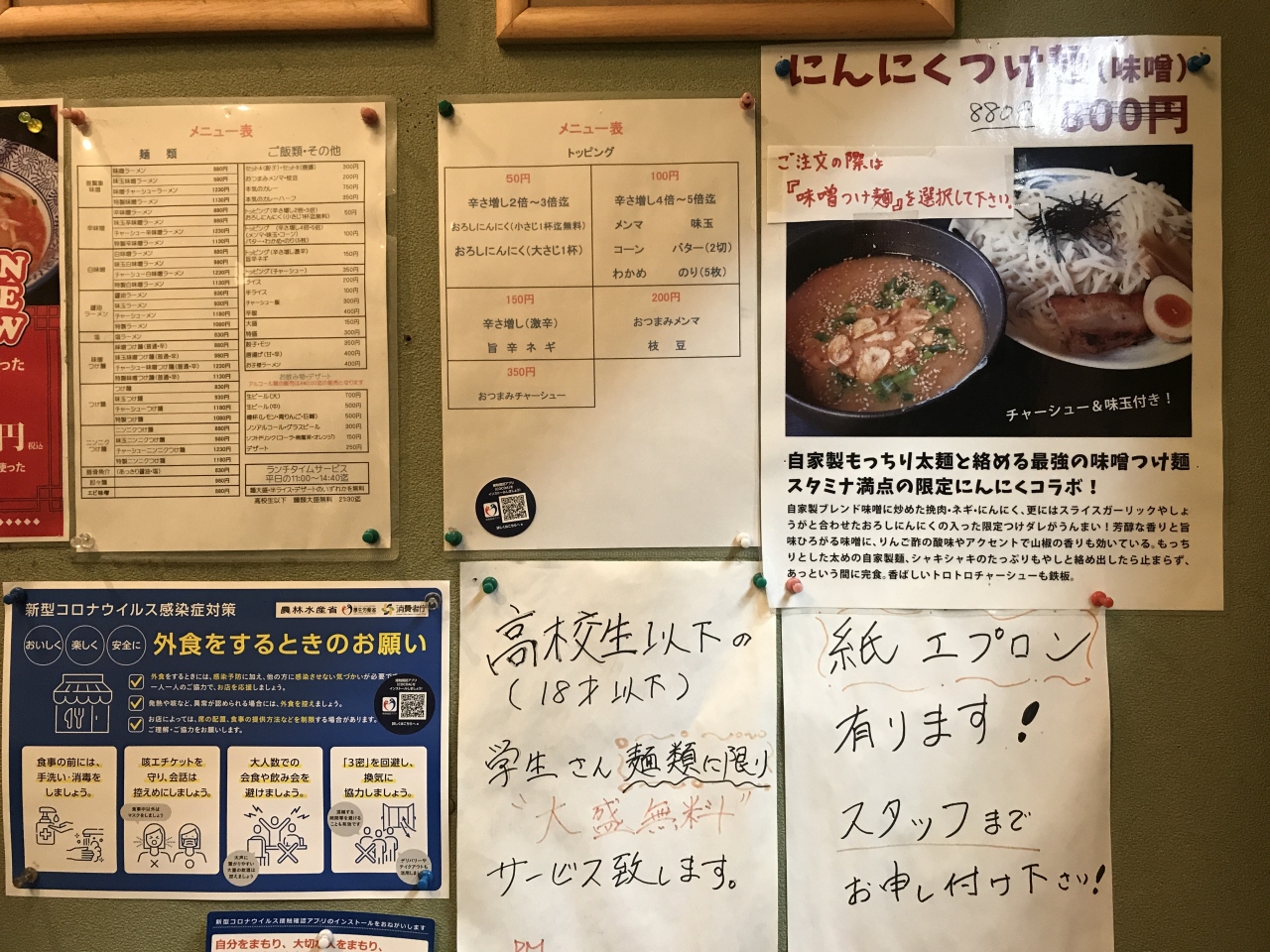 入り口横の券売機にて食券を購入してから中へ入る形になっています。あまり綺麗ではありませんが、各料理の写真もあるので選ぶ時の参考になるかもしれません。一口サイズのチャーシューは非常に柔らかく、ちぢれ麺と味噌スープがよくマッチしているなぁと感じました。もやしが存在感を遺憾なく発揮しており、最初に出てきた時は二郎系に来てしまったかと思いましたがあまり関係はなさそう。カウンター以外にテーブルや小上がり式の席もあるので一人でも複数人でも問題なく利用できそうです。