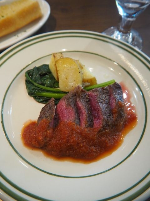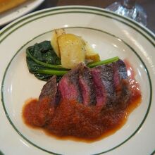 メインの牛ステーキは、一口サイズにカットされ、トマトベースのフルーティーなソースが添えられていた。