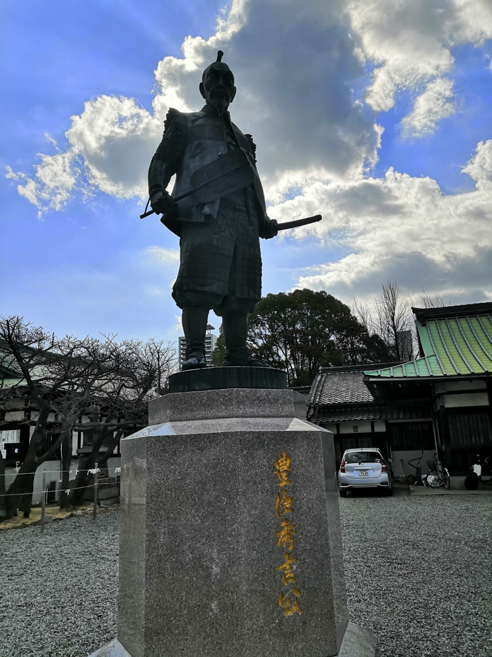 大阪城公園内にある豊國神社の鳥居近くにあります。豊國神社は、豊臣秀吉・秀頼・秀長の三名をを御祭神としてはいますが、大坂城の築城に関しては秀吉によるところが大きいとは思うので、秀吉の像だけでも自然な感じがしました。